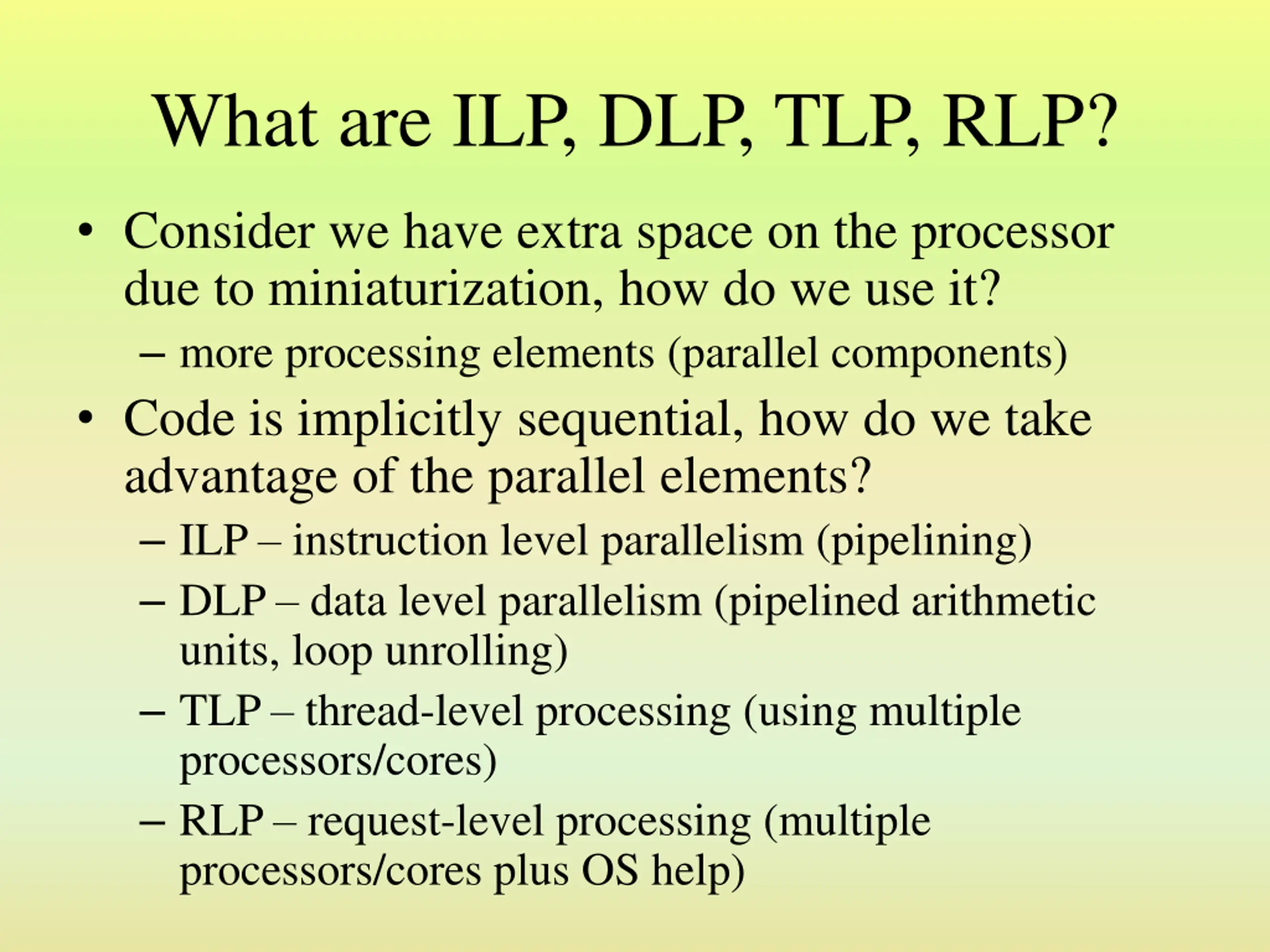 What are ILP, DLP, TLP, RLP? Consider we have extra space on the processor due to miniaturization, how do we use it? more processing elements (parallel components) Code is implicitly sequential, how do we take advantage of the parallel elements? ILP instruction level parallelism (pipelining) DLP data level parallelism (pipelined arithmetic units, loop unrolling) TLP thread-level processing (using multiple processors/cores) RLP request-level processing (multiple processors/cores plus OS help)
