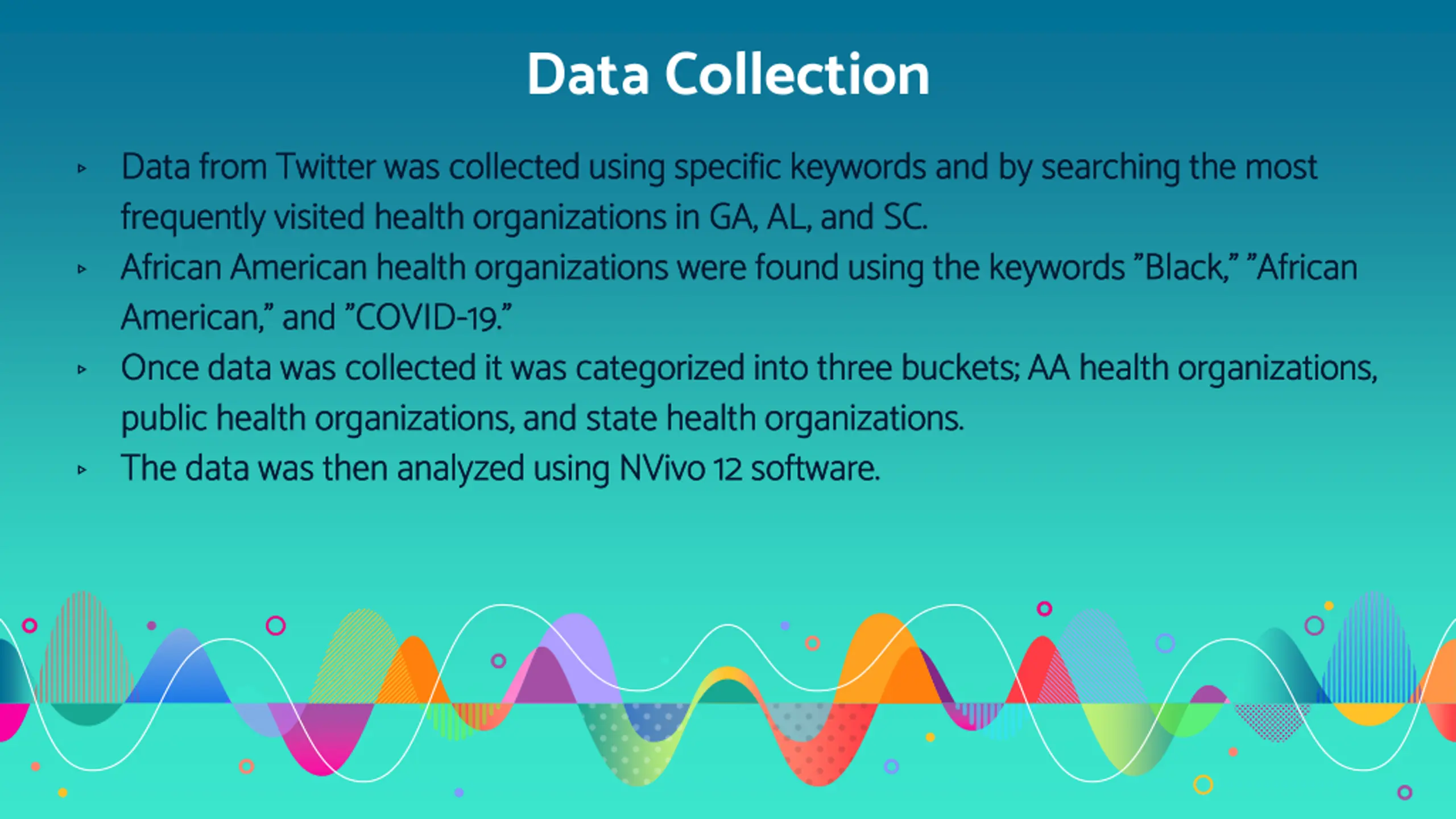 Data Collection Data from Twitter was collected using specific keywords and by searching the most frequently visited health organizations in GA, AL, and SC. African American health organizations were found using the keywords "Black," "African American," and "COVID Once data was collected it was categorized into three buckets; AA health organizations, public health organizations, and state health organizations. The data was then analyzed using NVivo 12 software. Data from Twitter was collected using specific keywords and by searching the most frequently visited health organizations in GA, AL, and SC. African American health organizations were found using the keywords "Black," "African American," and "COVID- -19." Once data was collected it was categorized into three buckets; AA health organizations, public health organizations, and state health organizations. The data was then analyzed using NVivo 12 software. 19."
