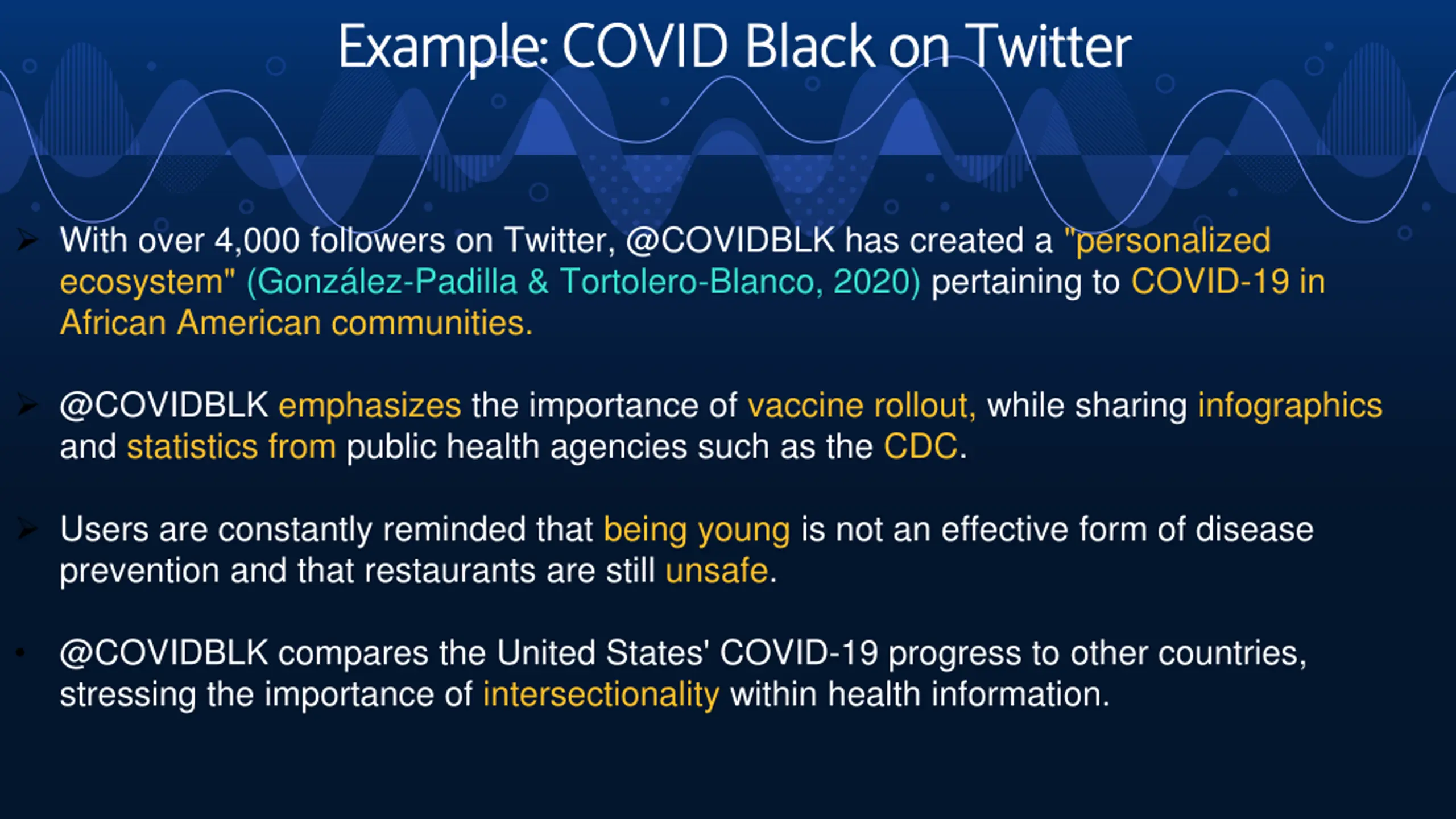 Example: COVID Black on Twitter Example: COVID Black on Twitter With over 4,000 followers on Twitter, @COVIDBLK has created a "personalized ecosystem" (Gonz lez-Padilla & Tortolero-Blanco, 2020) pertaining to COVID-19 in African American communities. @COVIDBLK emphasizes the importance of vaccine rollout, while sharing infographics and statistics from public health agencies such as the CDC. Users are constantly reminded that being young is not an effective form of disease prevention and that restaurants are still unsafe. @COVIDBLK compares the United States' COVID-19 progress to other countries, stressing the importance of intersectionality within health information.