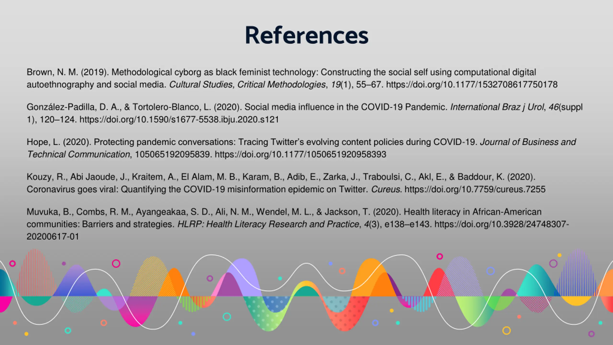 References Brown, N. M. (2019). Methodological cyborg as black feminist technology: Constructing the social self using computational digital autoethnography and social media. Cultural Studies, Critical Methodologies, 19(1), 55 67. https://doi.org/10.1177/1532708617750178 Gonz lez-Padilla, D. A., & Tortolero-Blanco, L. (2020). Social media influence in the COVID-19 Pandemic. International Braz j Urol, 46(suppl 1), 120 124. https://doi.org/10.1590/s1677-5538.ibju.2020.s121 Hope, L. (2020). Protecting pandemic conversations: Tracing Twitter s evolving content policies during COVID-19. Journal of Business and Technical Communication, 105065192095839. https://doi.org/10.1177/1050651920958393 Kouzy, R., Abi Jaoude, J., Kraitem, A., El Alam, M. B., Karam, B., Adib, E., Zarka, J., Traboulsi, C., Akl, E., & Baddour, K. (2020). Coronavirus goes viral: Quantifying the COVID-19 misinformation epidemic on Twitter. Cureus. https://doi.org/10.7759/cureus.7255 Muvuka, B., Combs, R. M., Ayangeakaa, S. D., Ali, N. M., Wendel, M. L., & Jackson, T. (2020). Health literacy in African-American communities: Barriers and strategies. HLRP: Health Literacy Research and Practice, 4(3), e138 e143. https://doi.org/10.3928/24748307- 20200617-01