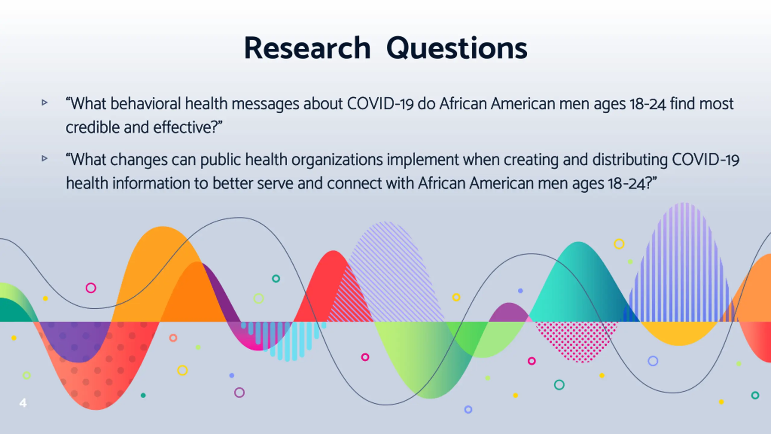 Research Questions What behavioral health messages about COVID credible and effective? What changes can public health organizations implement when creating and distributing COVID health information to better serve and connect with African American men ages 18 What behavioral health messages about COVID- -19 do African American men credible and effective? What changes can public health organizations implement when creating and distributing COVID- -19 health information to better serve and connect with African American men ages 18- -24? 19 do African American men ages 18 ages 18- -24 find most 24 find most 19 24? 4