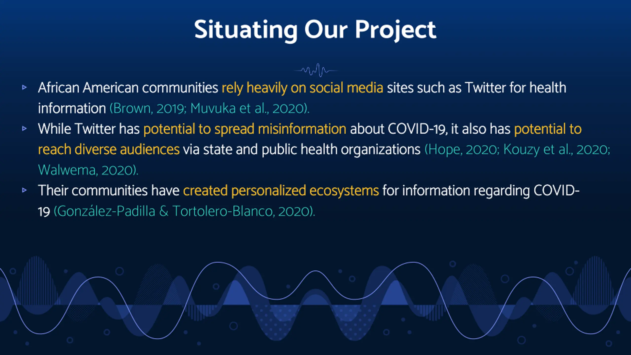 Situating Our Project African American communities information While Twitter has reach diverse audiences Walwema, 2020). Their communities have 19 19 (Gonz lez-Padilla & Tortolero-Blanco, 2020). African American communities rely heavily on social media information (Brown, 2019; Muvuka et al., 2020). While Twitter has potential to spread misinformation reach diverse audiences via state and public health organizations rely heavily on social media sites such as Twitter sites such as Twitter for health for health potential to spread misinformation about COVID via state and public health organizations (Hope, 2020; Kouzy et al., 2020; about COVID- -19, 19, it also has it also has potential potential to to Their communities have created personalized ecosystems created personalized ecosystems for information regarding for information regarding COVID COVID- -