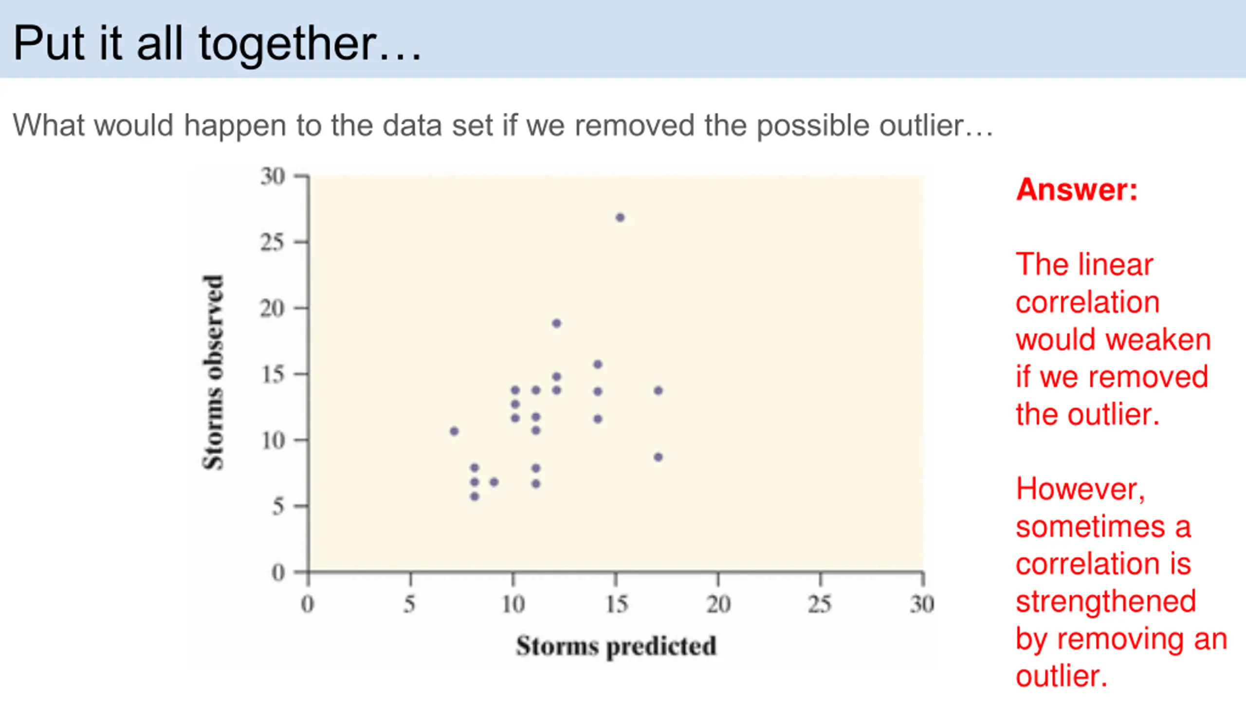 Put it all together What would happen to the data set if we removed the possible outlier Answer: The linear correlation would weaken if we removed the outlier. However, sometimes a correlation is strengthened by removing an outlier.
