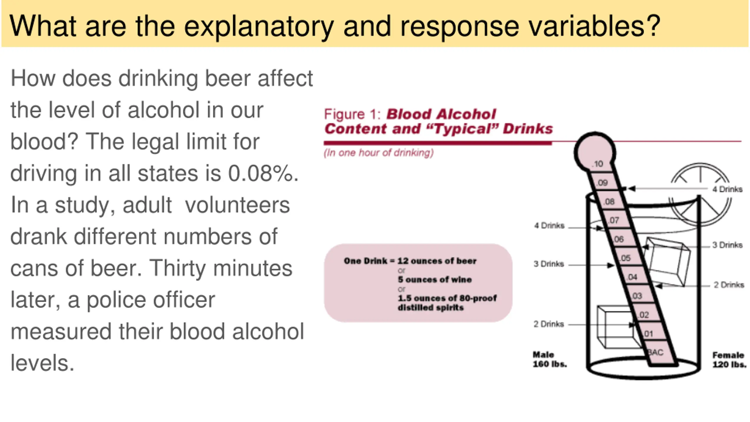 What are the explanatory and response variables? How does drinking beer affect the level of alcohol in our blood? The legal limit for driving in all states is 0.08%. In a study, adult volunteers drank different numbers of cans of beer. Thirty minutes later, a police officer measured their blood alcohol levels.
