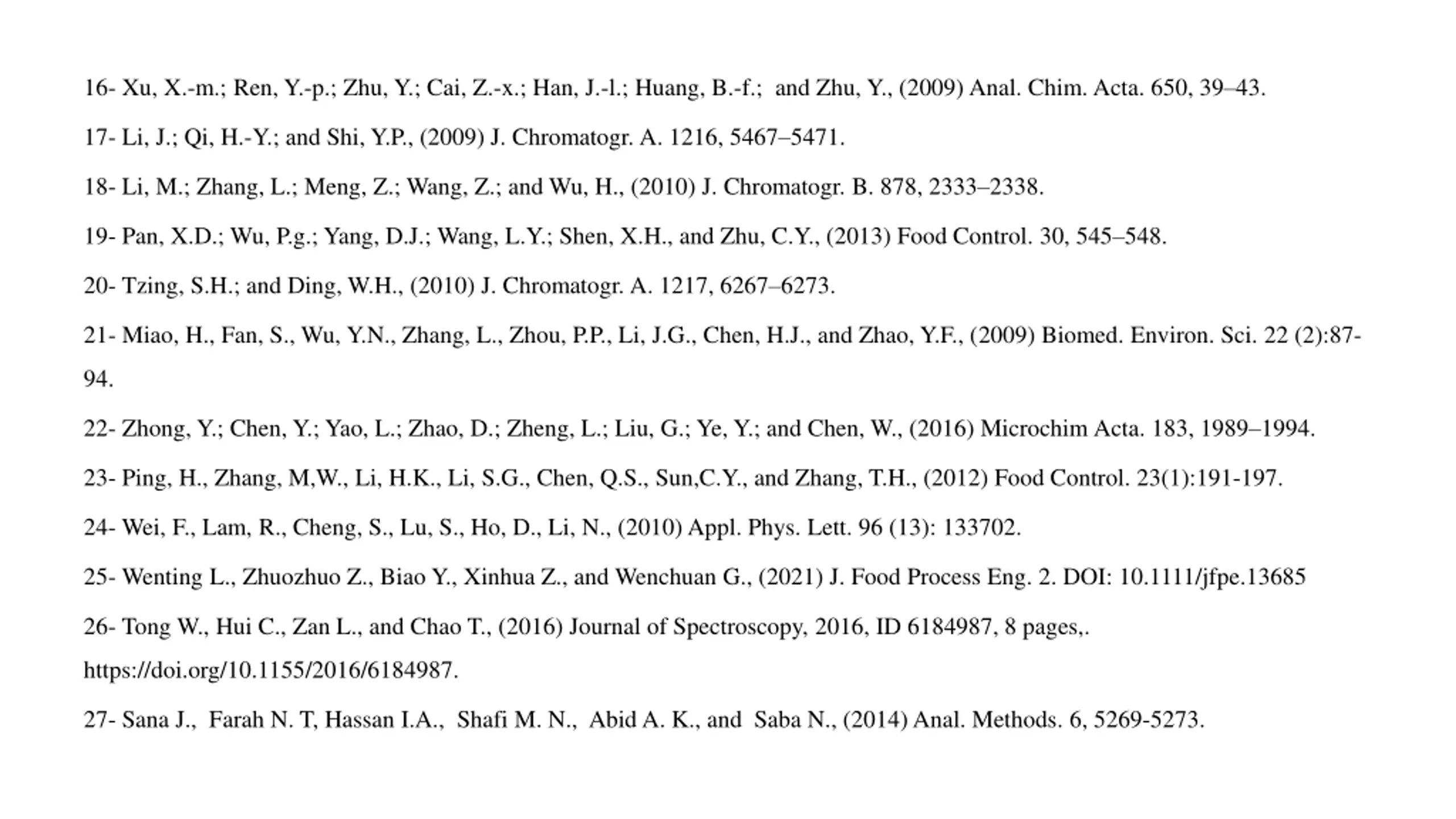16- Xu, X.-m.; Ren, Y.-p.; Zhu, Y.; Cai, Z.-x.; Han, J.-l.; Huang, B.-f.; and Zhu, Y., (2009) Anal. Chim. Acta. 650, 3943. 17- Li, J.; Qi, H.-Y.; and Shi, Y.P., (2009) J. Chromatogr. A. 1216, 5467 5471. 18- Li, M.; Zhang, L.; Meng, Z.; Wang, Z.; and Wu, H., (2010) J. Chromatogr. B. 878, 2333 2338. 19- Pan, X.D.; Wu, P.g.; Yang, D.J.; Wang, L.Y.; Shen, X.H., and Zhu, C.Y., (2013) Food Control. 30, 545 548. 20- Tzing, S.H.; and Ding, W.H., (2010) J. Chromatogr. A. 1217, 6267 6273. 21- Miao, H., Fan, S., Wu, Y.N., Zhang, L., Zhou, P.P., Li, J.G., Chen, H.J., and Zhao, Y.F., (2009) Biomed. Environ. Sci. 22 (2):87- 94. 22- Zhong, Y.; Chen, Y.; Yao, L.; Zhao, D.; Zheng, L.; Liu, G.; Ye, Y.; and Chen, W., (2016) Microchim Acta. 183, 1989 1994. 23- Ping, H., Zhang, M,W., Li, H.K., Li, S.G., Chen, Q.S., Sun,C.Y., and Zhang, T.H., (2012) Food Control. 23(1):191-197. 24- Wei, F., Lam, R., Cheng, S., Lu, S., Ho, D., Li, N., (2010) Appl. Phys. Lett. 96 (13): 133702. 25- Wenting L., Zhuozhuo Z., Biao Y., Xinhua Z., and Wenchuan G., (2021) J. Food Process Eng. 2. DOI: 10.1111/jfpe.13685 26- Tong W., Hui C., Zan L., and Chao T., (2016) Journal of Spectroscopy, 2016, ID 6184987, 8 pages,. https://doi.org/10.1155/2016/6184987. 27- Sana J., Farah N. T, Hassan I.A., Shafi M. N., Abid A. K., and Saba N., (2014) Anal. Methods. 6, 5269-5273.