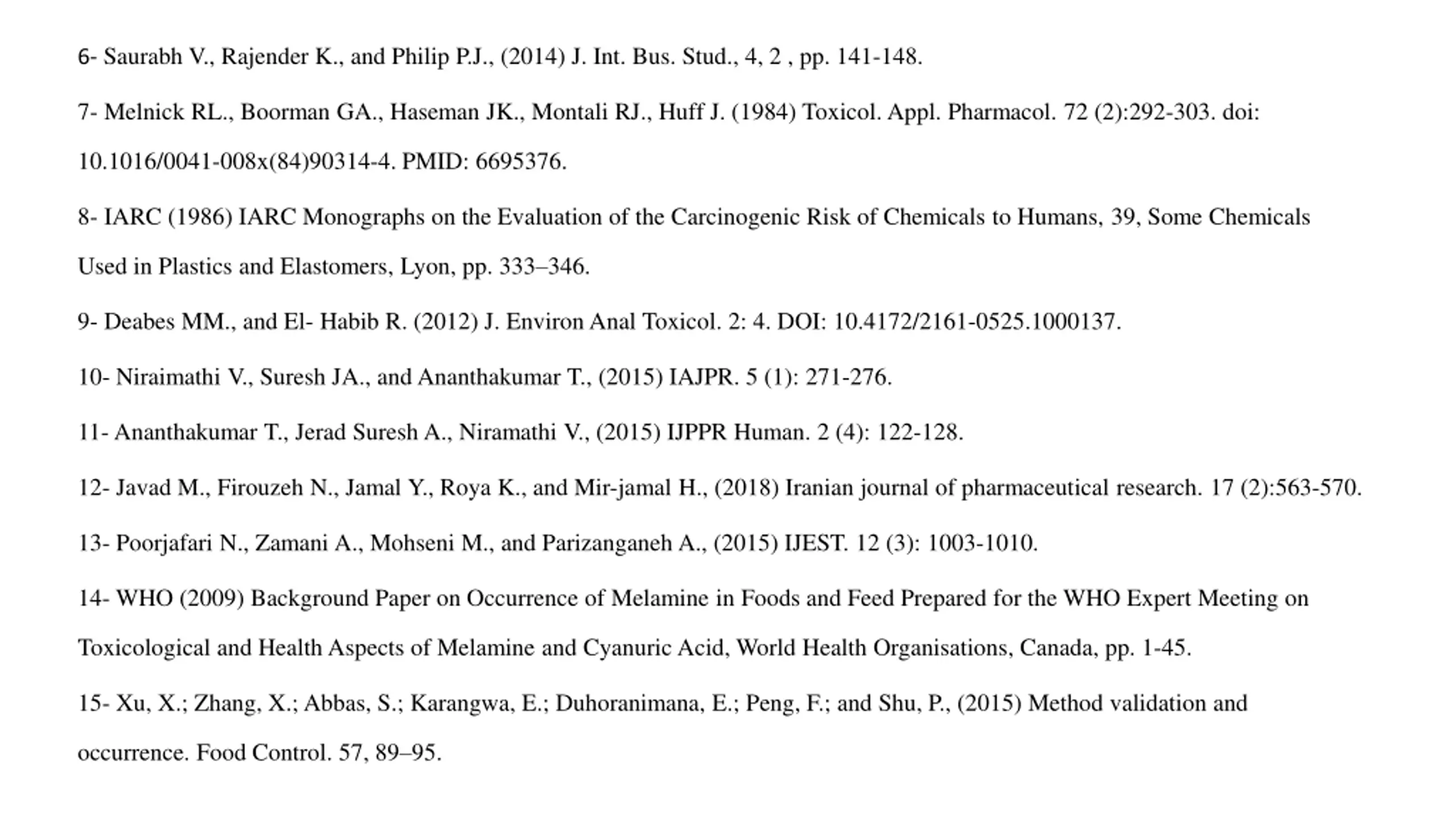6- Saurabh V., Rajender K., and Philip P.J., (2014) J. Int. Bus. Stud., 4, 2 , pp. 141-148. 7- Melnick RL., Boorman GA., Haseman JK., Montali RJ., Huff J. (1984) Toxicol. Appl. Pharmacol. 72 (2):292-303. doi: 10.1016/0041-008x(84)90314-4. PMID: 6695376. 8- IARC (1986) IARC Monographs on the Evaluation of the Carcinogenic Risk of Chemicals to Humans, 39, Some Chemicals Used in Plastics and Elastomers, Lyon, pp. 333 346. 9- Deabes MM., and El- Habib R. (2012) J. Environ Anal Toxicol. 2: 4. DOI: 10.4172/2161-0525.1000137. 10- Niraimathi V., Suresh JA., and Ananthakumar T., (2015) IAJPR. 5 (1): 271-276. 11- Ananthakumar T., Jerad Suresh A., Niramathi V., (2015) IJPPR Human. 2 (4): 122-128. 12- Javad M., Firouzeh N., Jamal Y., Roya K., and Mir-jamal H., (2018) Iranian journal of pharmaceutical research. 17 (2):563-570. 13- Poorjafari N., Zamani A., Mohseni M., and Parizanganeh A., (2015) IJEST. 12 (3): 1003-1010. 14- WHO (2009) Background Paper on Occurrence of Melamine in Foods and Feed Prepared for the WHO Expert Meeting on Toxicological and Health Aspects of Melamine and Cyanuric Acid, World Health Organisations, Canada, pp. 1-45. 15- Xu, X.; Zhang, X.; Abbas, S.; Karangwa, E.; Duhoranimana, E.; Peng, F.; and Shu, P., (2015) Method validation and occurrence. Food Control. 57, 89 95.