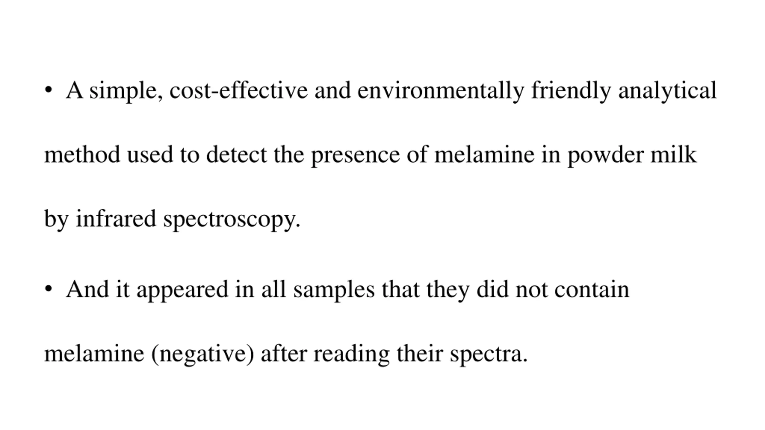 A simple, cost-effective and environmentally friendly analytical method used to detect the presence of melamine in powder milk by infrared spectroscopy. And it appeared in all samples that they did not contain melamine (negative) after reading their spectra.
