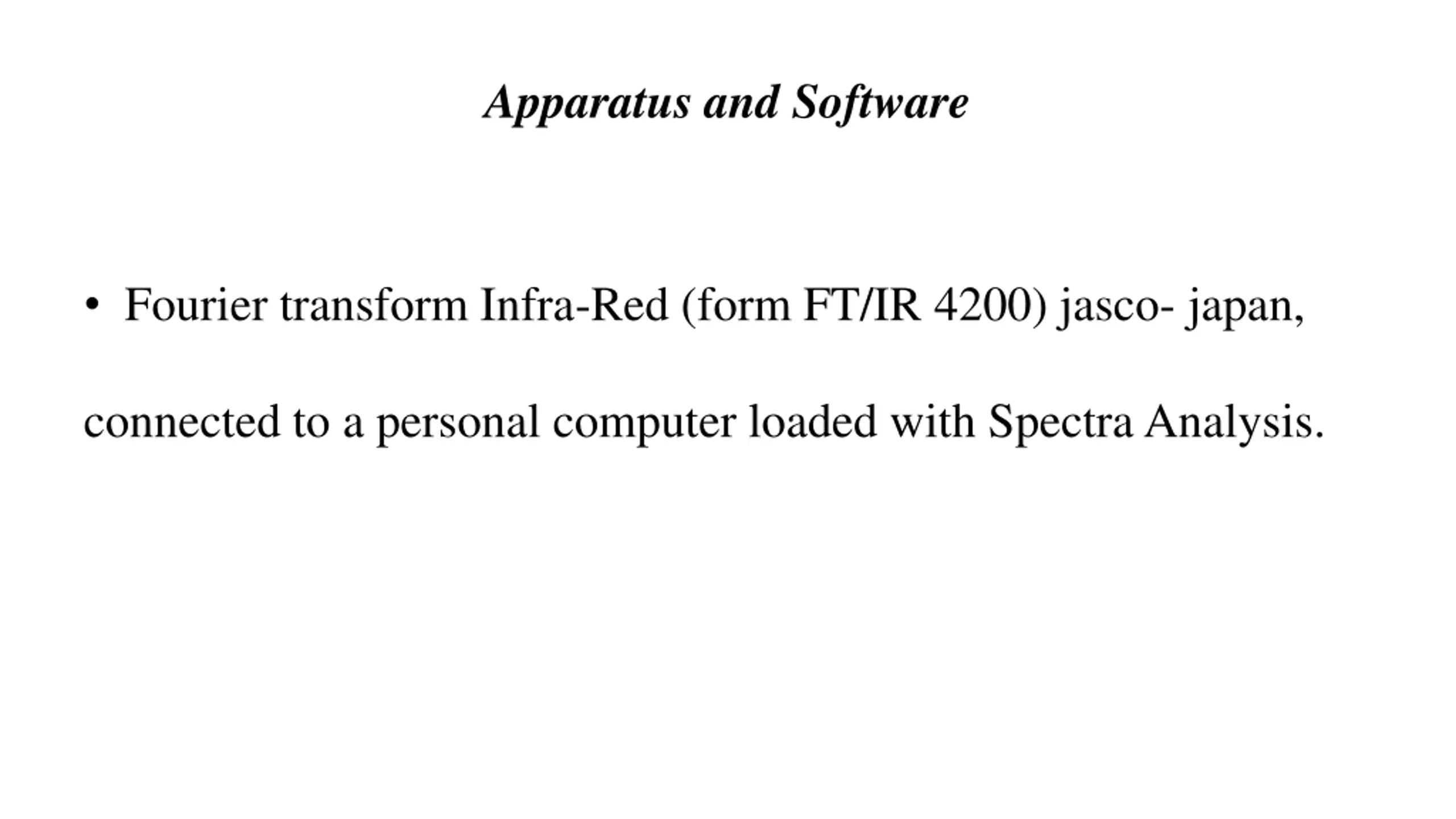 Apparatus and Software Fourier transform Infra-Red (form FT/IR 4200) jasco- japan, connected to a personal computer loaded with Spectra Analysis.