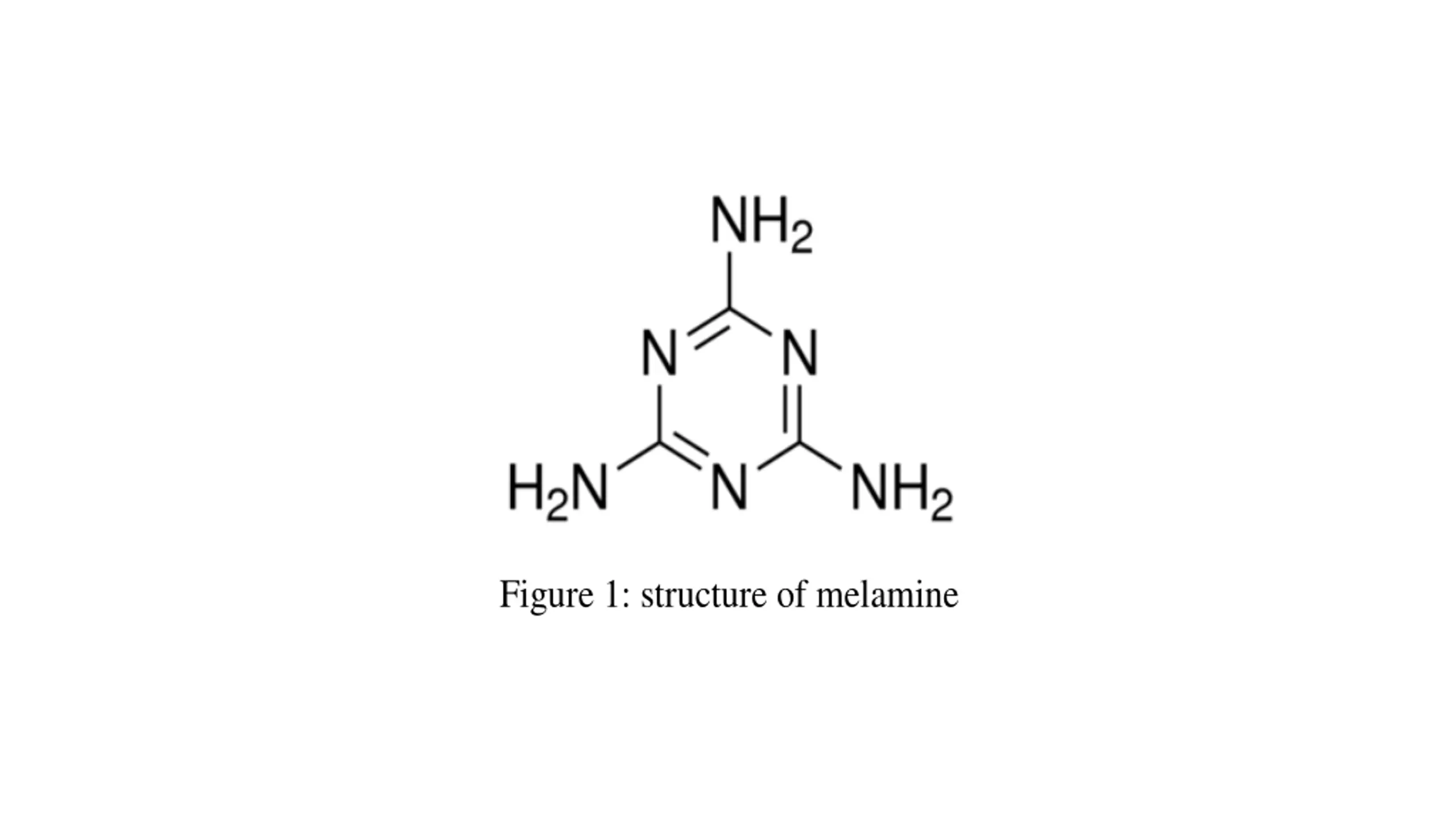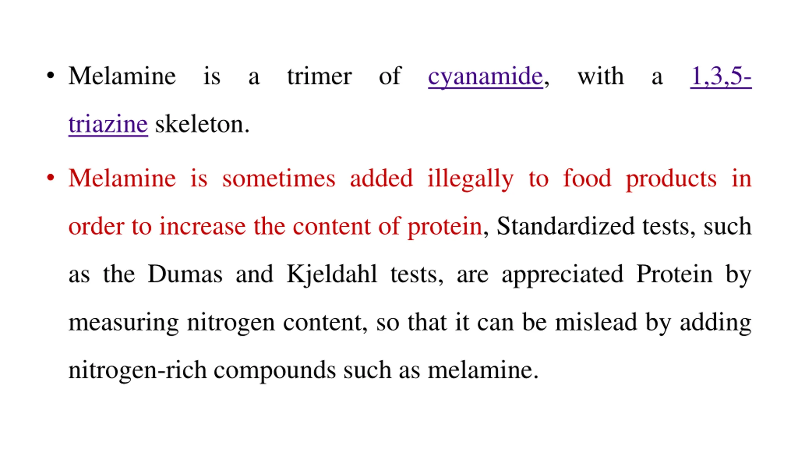 Melamine is a trimer of cyanamide, with a 1,3,5- triazine skeleton. Melamine is sometimes added illegally to food products in order to increase the content of protein, Standardized tests, such as the Dumas and Kjeldahl tests, are appreciated Protein by measuring nitrogen content, so that it can be mislead by adding nitrogen-rich compounds such as melamine.