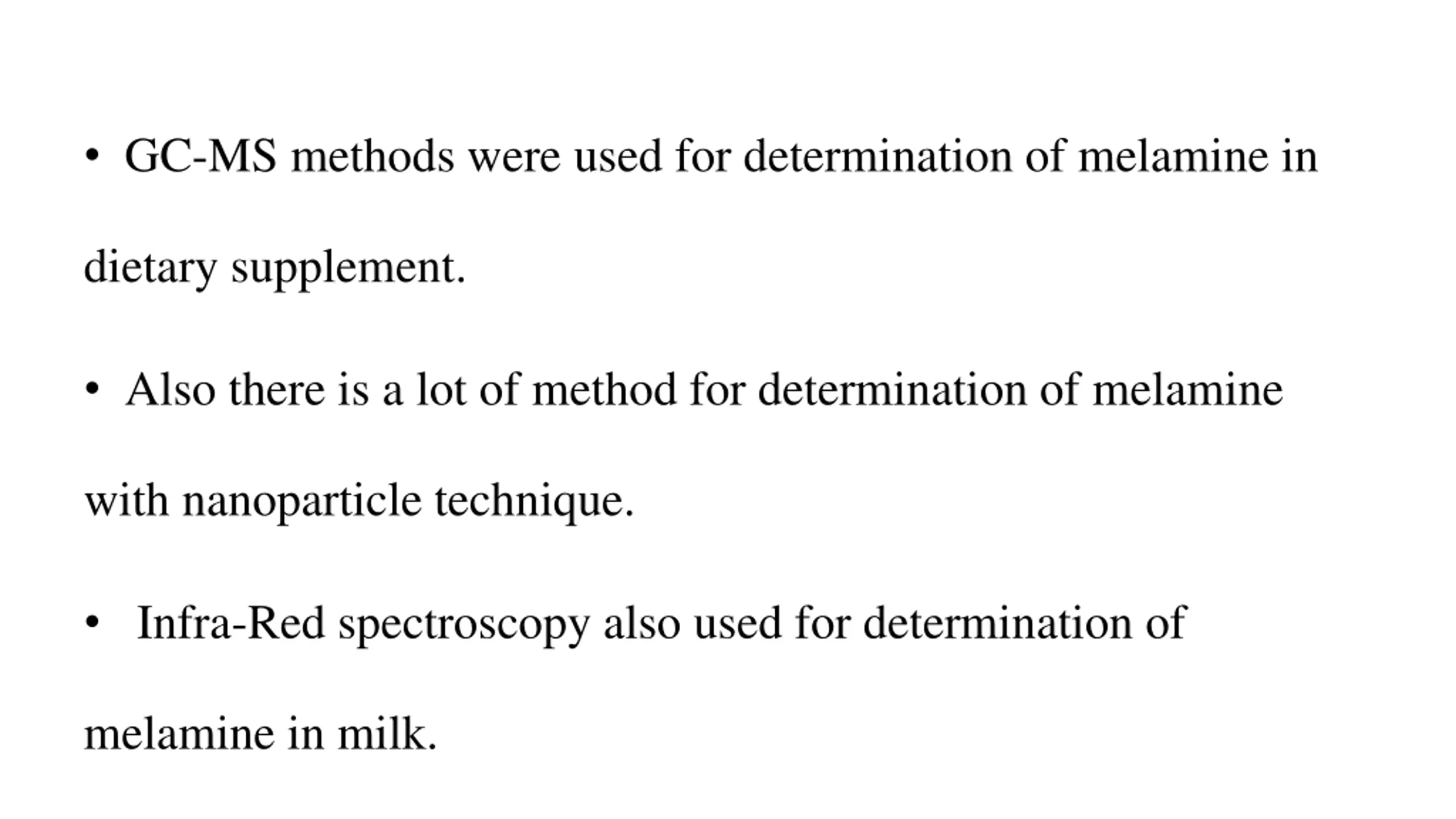 GC-MS methods were used for determination of melamine in dietary supplement. Also there is a lot of method for determination of melamine with nanoparticle technique. Infra-Red spectroscopy also used for determination of melamine in milk.