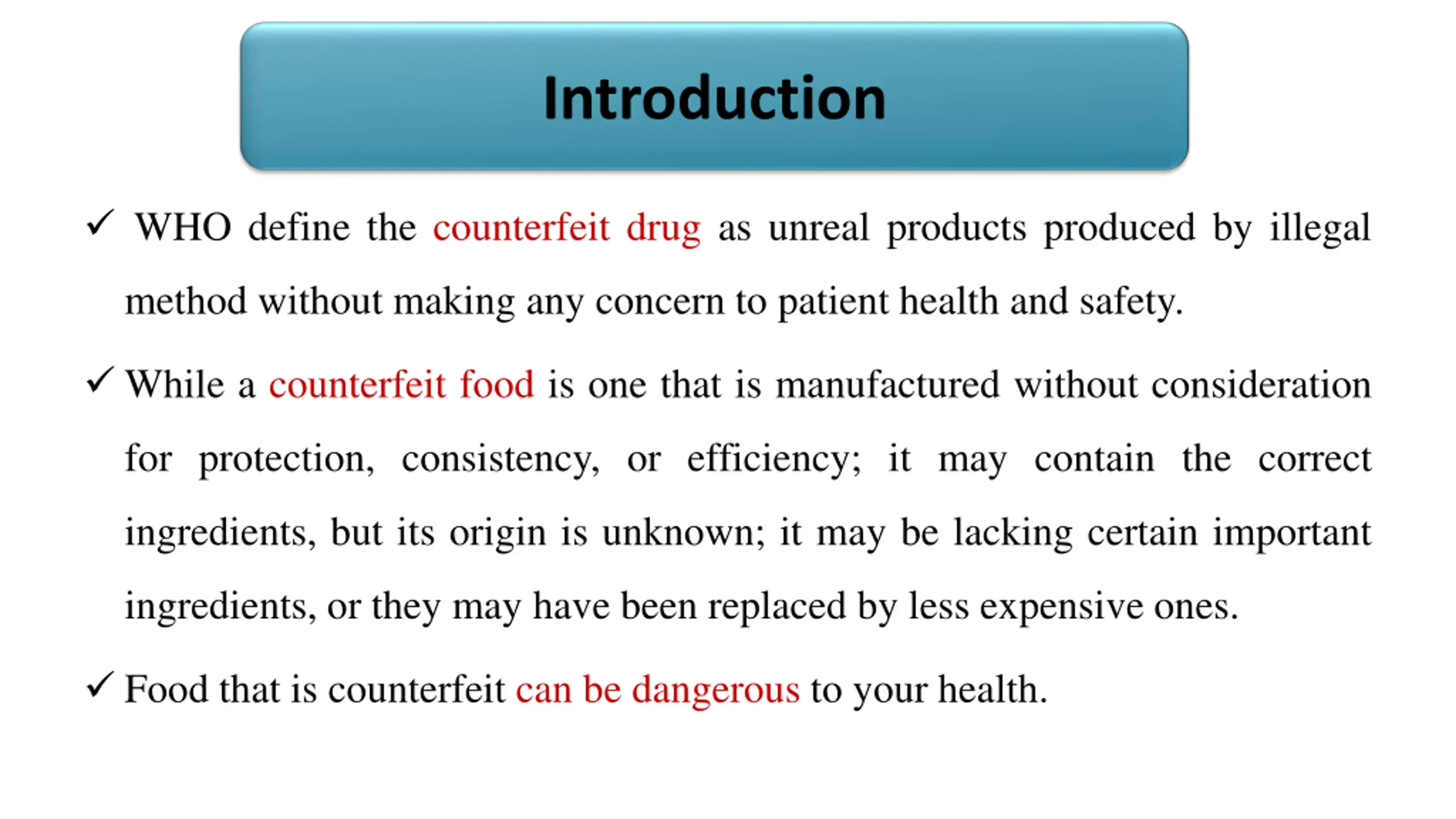 Introduction WHO define the counterfeit drug as unreal products produced by illegal method without making any concern to patient health and safety. While a counterfeit food is one that is manufactured without consideration for protection, consistency, or efficiency; it may contain the correct ingredients, but its origin is unknown; it may be lacking certain important ingredients, or they may have been replaced by less expensive ones. Food that is counterfeit can be dangerous to your health.