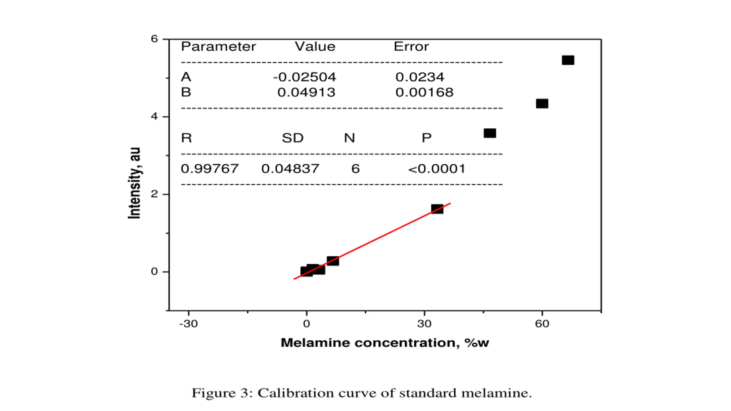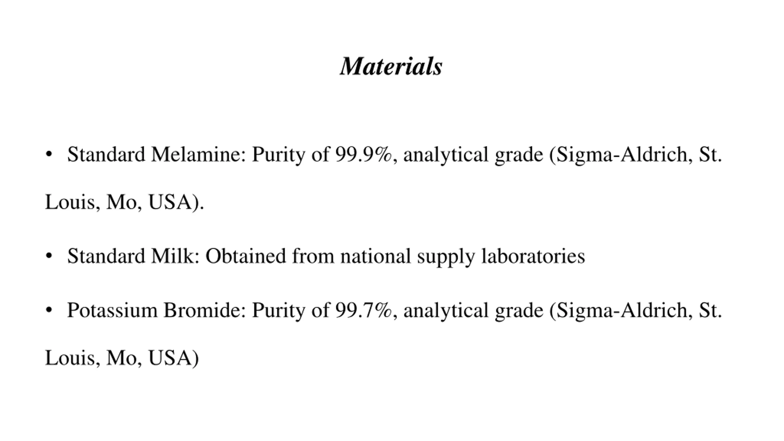 Materials Standard Melamine:Purity of 99.9%, analytical grade (Sigma-Aldrich, St. Louis, Mo, USA). Standard Milk: Obtained from national supply laboratories Potassium Bromide: Purity of 99.7%, analytical grade (Sigma-Aldrich, St. Louis, Mo, USA)