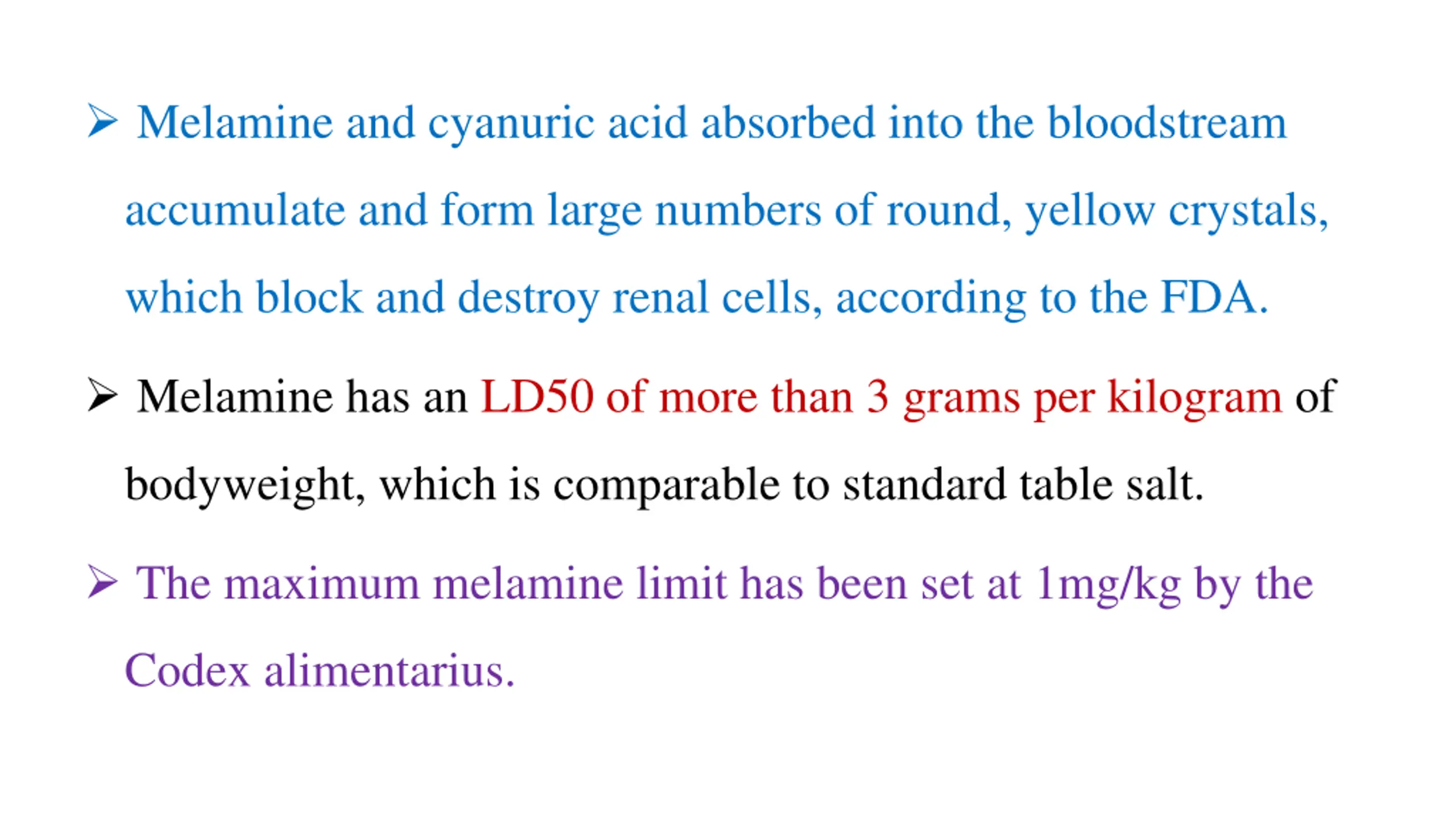 Melamine and cyanuric acid absorbed into the bloodstream accumulate and form large numbers of round, yellow crystals, which block and destroy renal cells, according to the FDA. Melamine has an LD50 of more than 3 grams per kilogram of bodyweight, which is comparable to standard table salt. The maximum melamine limit has been set at 1mg/kg by the Codex alimentarius.