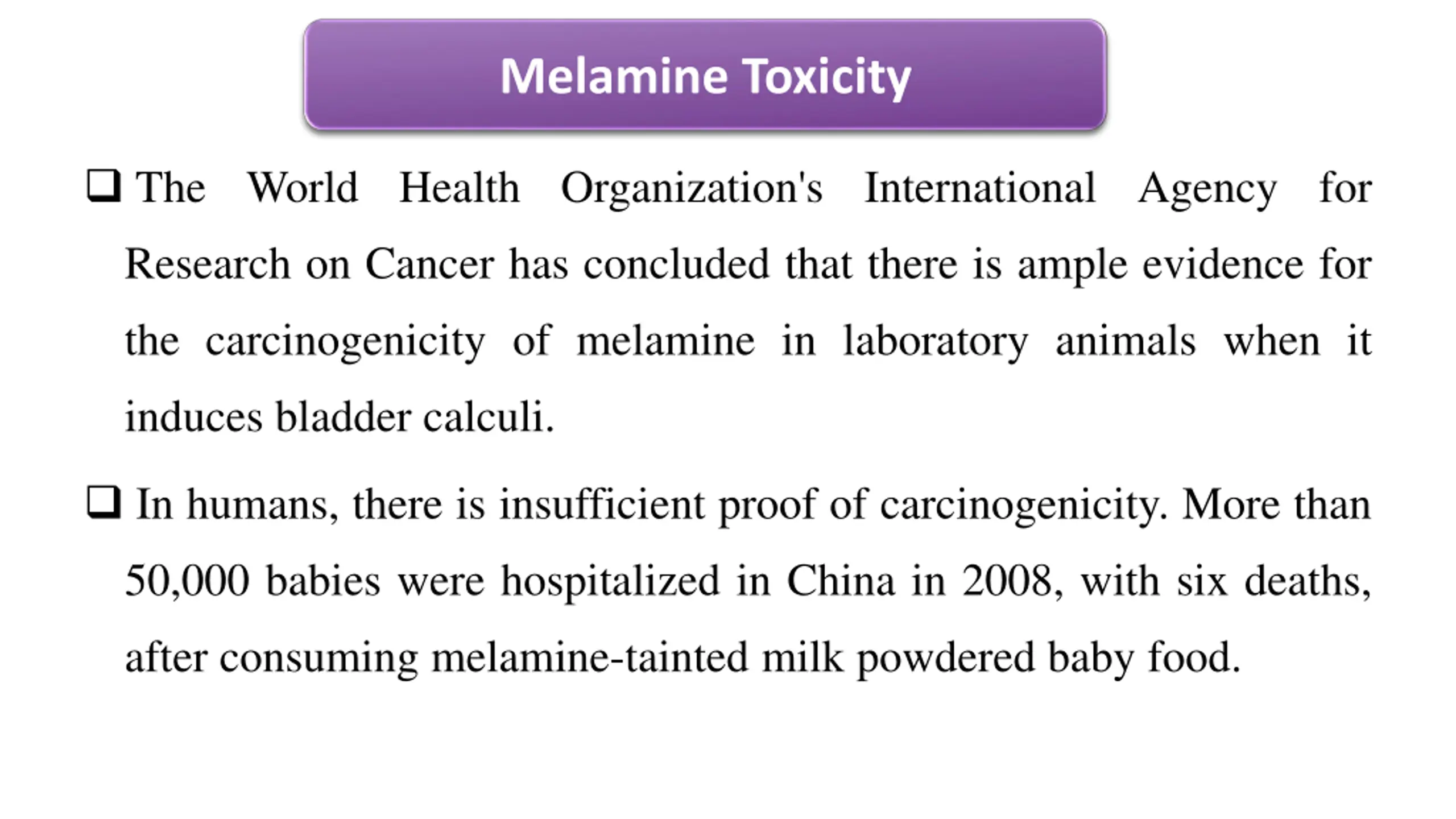 Melamine Toxicity The World Health Organization's International Agency for Research on Cancer has concluded that there is ample evidence for the carcinogenicity of melamine in laboratory animals when it induces bladder calculi. In humans, there is insufficient proof of carcinogenicity. More than 50,000 babies were hospitalized in China in 2008, with six deaths, after consuming melamine-tainted milk powdered baby food.