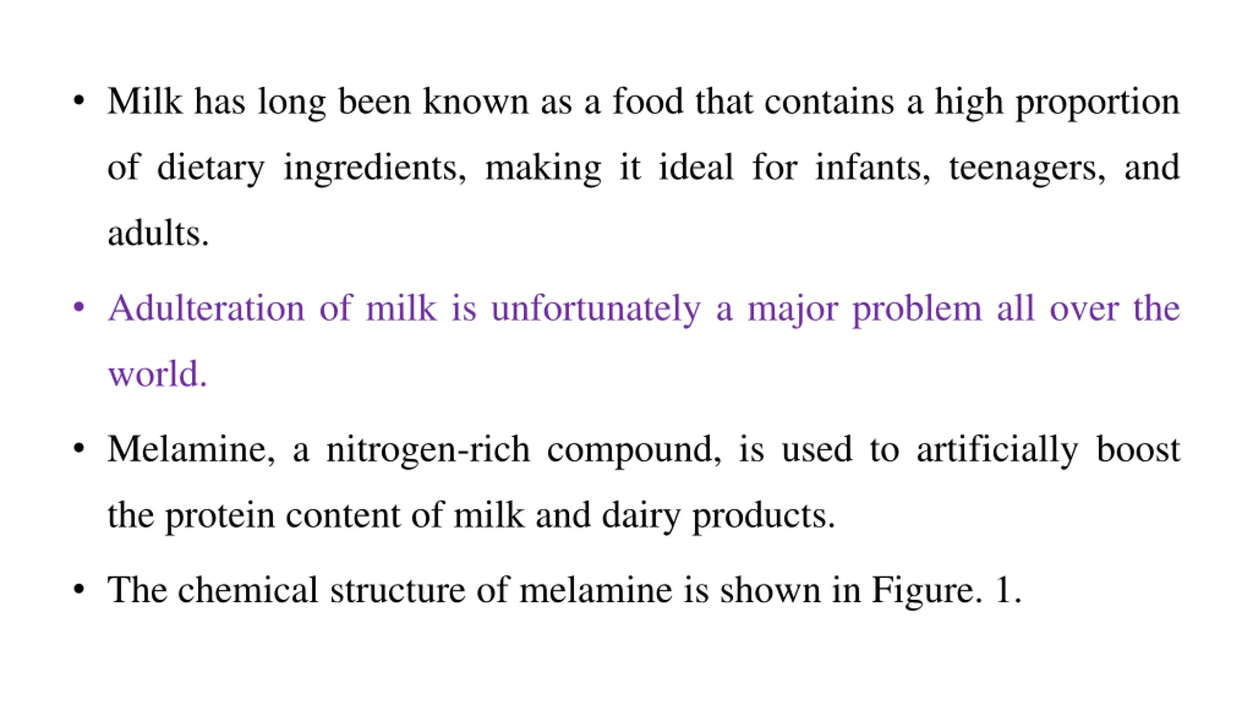 Milk has long been known as a food that contains a high proportion of dietary ingredients, making it ideal for infants, teenagers, and adults. Adulteration of milk is unfortunately a major problem all over the world. Melamine, a nitrogen-rich compound, is used to artificially boost the protein content of milk and dairy products. The chemical structure of melamine is shown in Figure. 1.