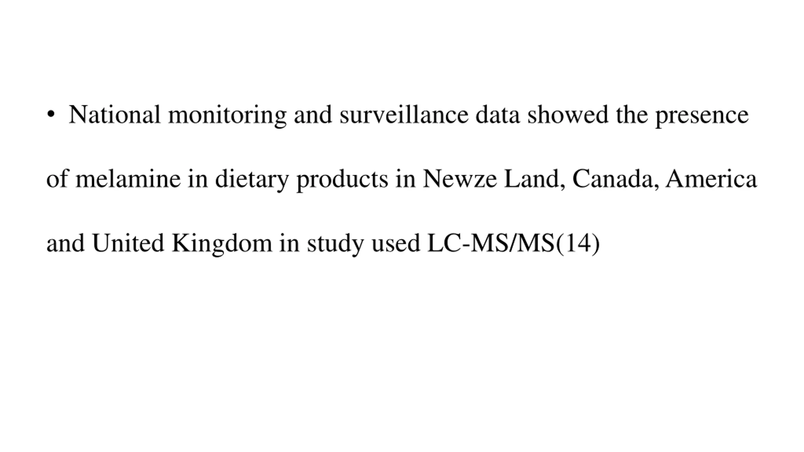 National monitoring and surveillance data showed the presence of melamine in dietary products in Newze Land, Canada, America and United Kingdom in study used LC-MS/MS(14)