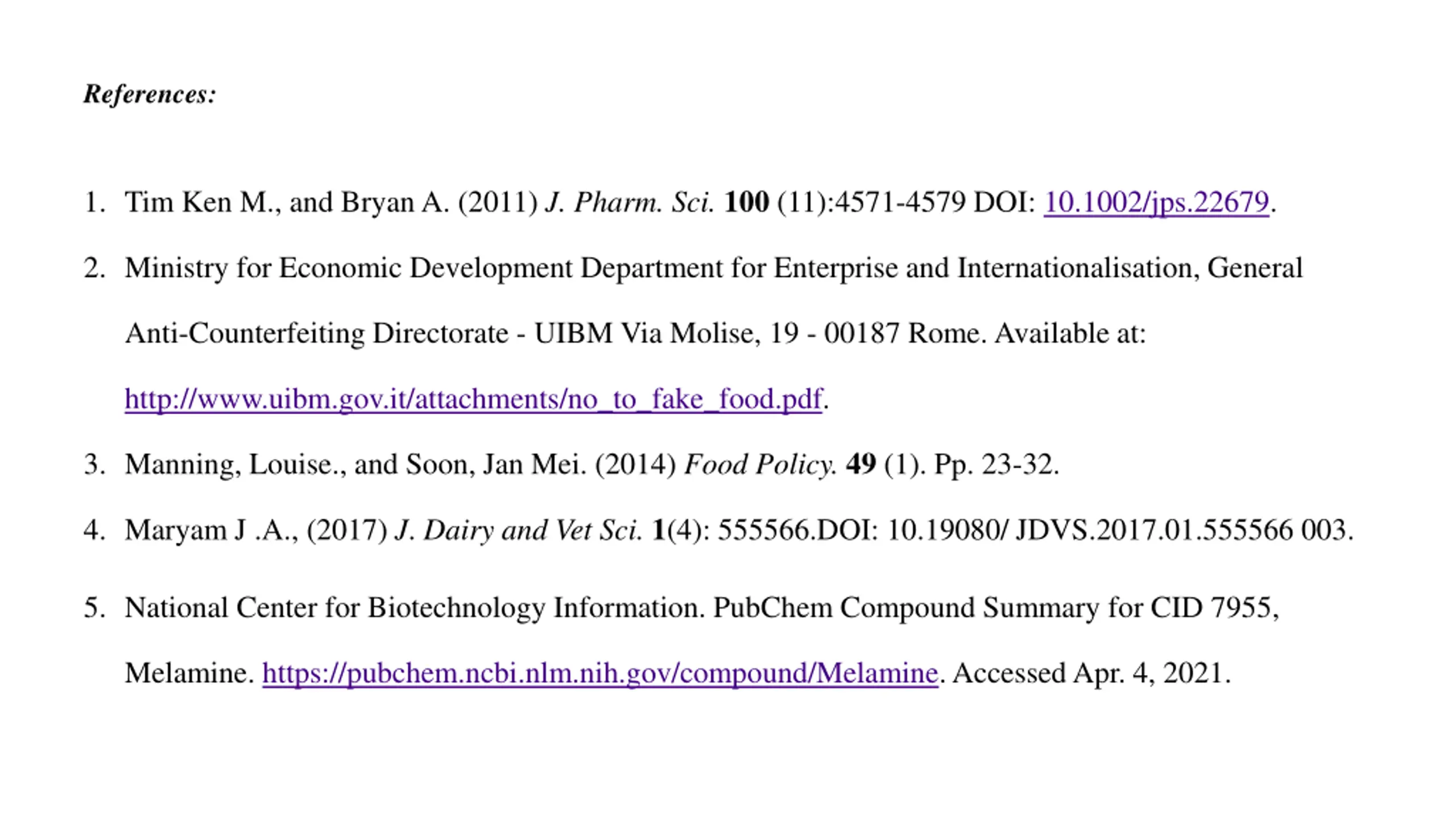 References: 1. Tim Ken M., and Bryan A. (2011) J. Pharm. Sci. 100 (11):4571-4579 DOI: 10.1002/jps.22679. 2. Ministry for Economic Development Department for Enterprise and Internationalisation, General Anti-Counterfeiting Directorate - UIBM Via Molise, 19 - 00187 Rome. Available at: http://www.uibm.gov.it/attachments/no_to_fake_food.pdf. 3. Manning, Louise., and Soon, Jan Mei. (2014) Food Policy. 49 (1). Pp. 23-32. 4. Maryam J .A., (2017) J. Dairy and Vet Sci. 1(4): 555566.DOI: 10.19080/ JDVS.2017.01.555566 003. 5. National Center for Biotechnology Information. PubChem Compound Summary for CID 7955, Melamine. https://pubchem.ncbi.nlm.nih.gov/compound/Melamine. Accessed Apr. 4, 2021.