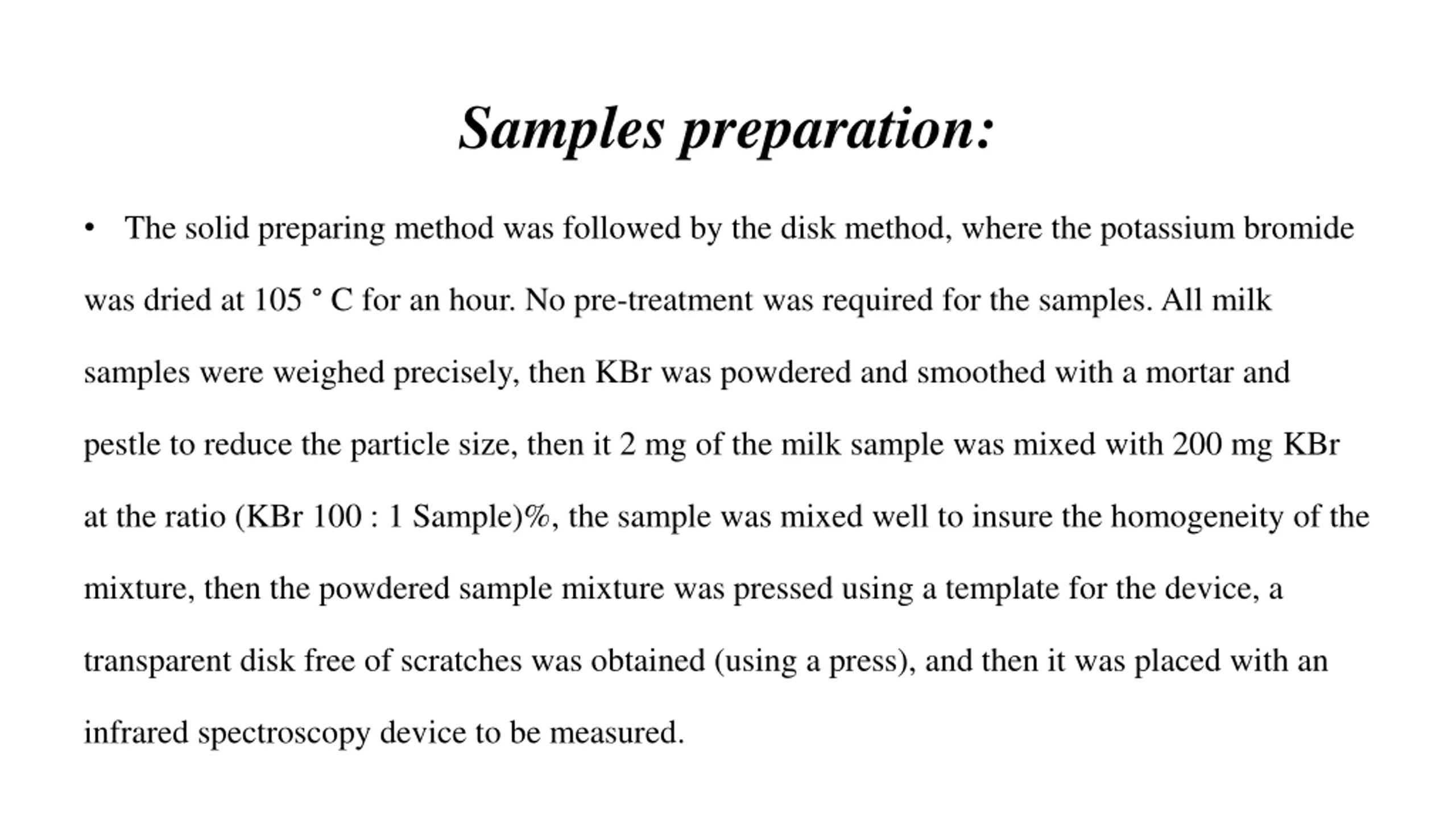 Samples preparation: The solid preparing method was followed by the disk method, where the potassium bromide was dried at 105 C for an hour. No pre-treatment was required for the samples. All milk samples were weighed precisely, then KBr was powdered and smoothed with a mortar and pestle to reduce the particle size, then it 2 mg of the milk sample was mixed with 200 mg KBr at the ratio (KBr 100 : 1 Sample)%, the sample was mixed well to insure the homogeneity of the mixture, then the powdered sample mixture was pressed using a template for the device, a transparent disk free of scratches was obtained (using a press), and then it was placed with an infrared spectroscopy device to be measured.