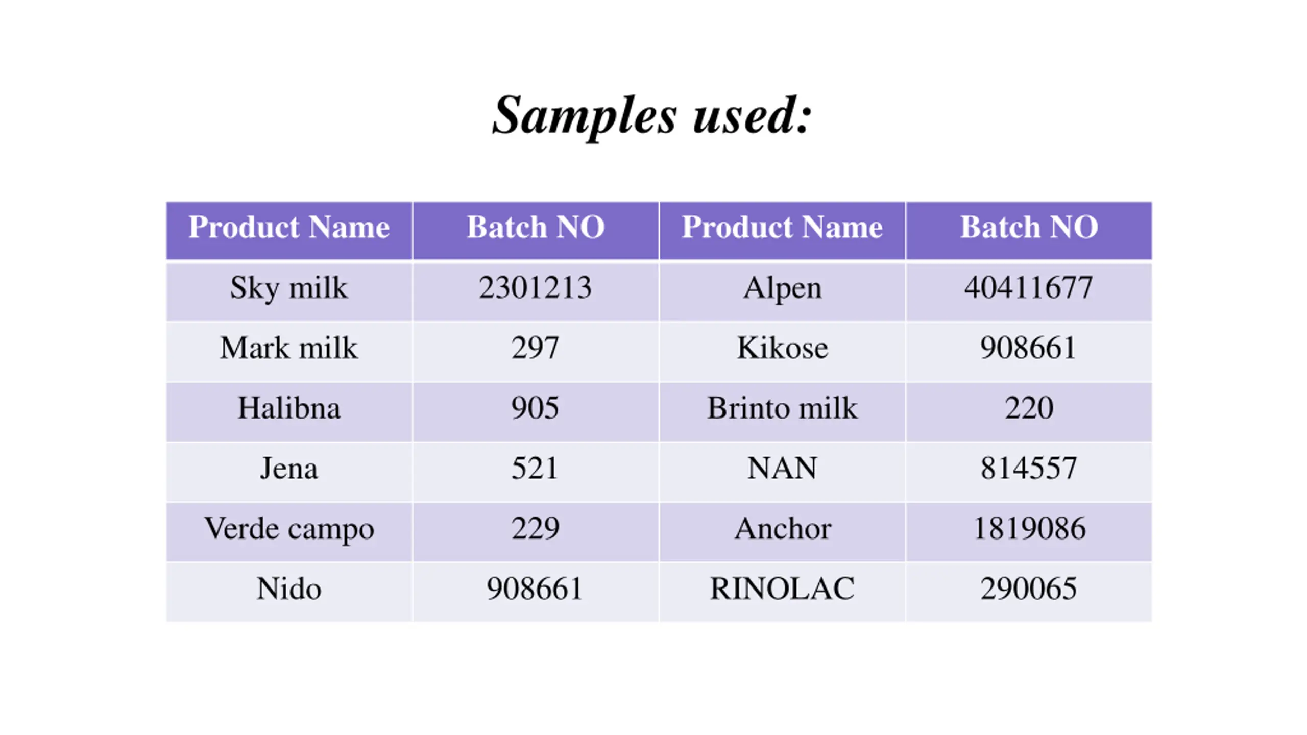 Samples used: Product Name Batch NO Product Name Batch NO Sky milk 2301213 Alpen 40411677 Mark milk 297 Kikose 908661 Halibna 905 Brinto milk 220 Jena 521 NAN 814557 Verde campo 229 Anchor 1819086 Nido 908661 RINOLAC 290065