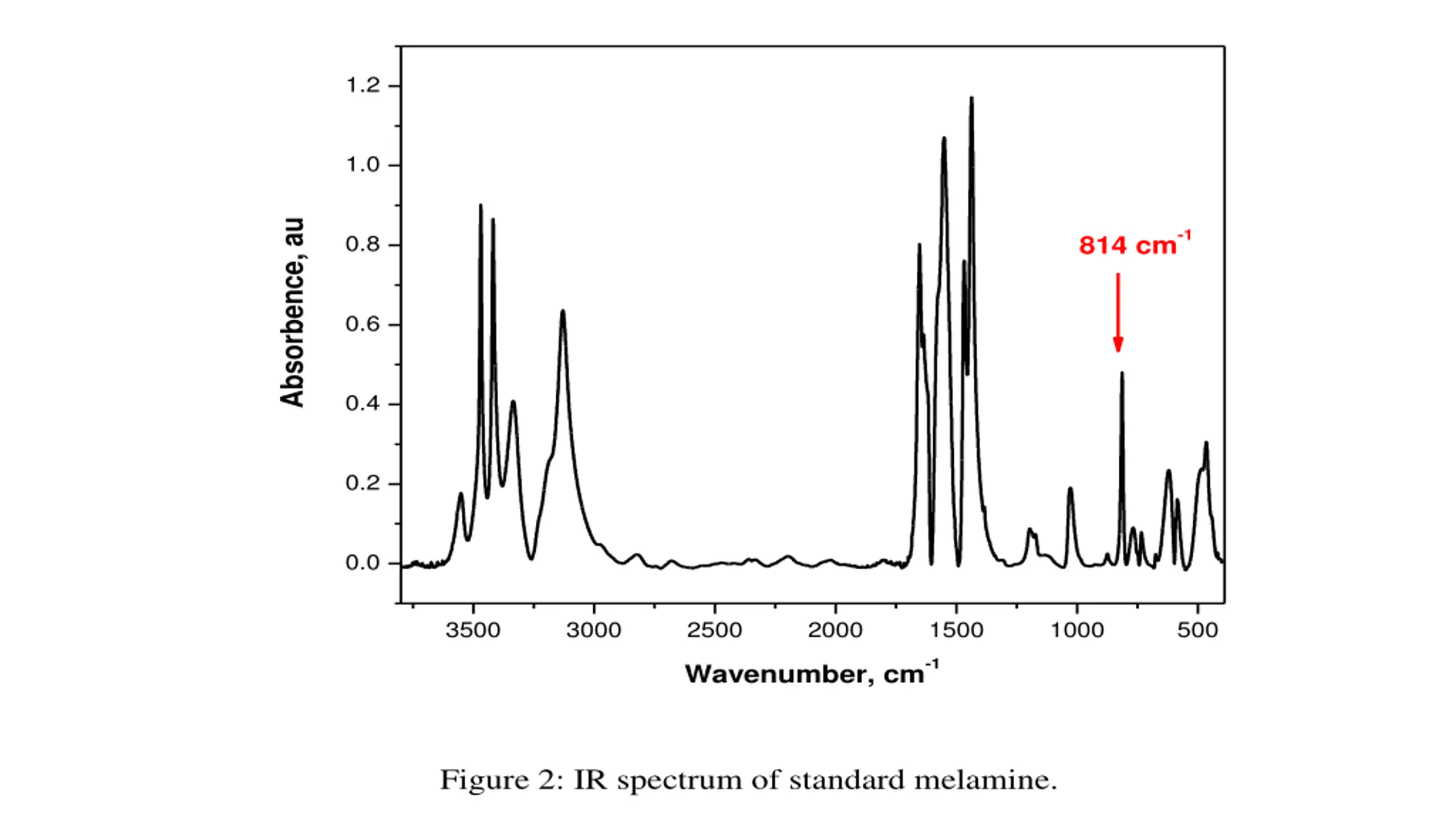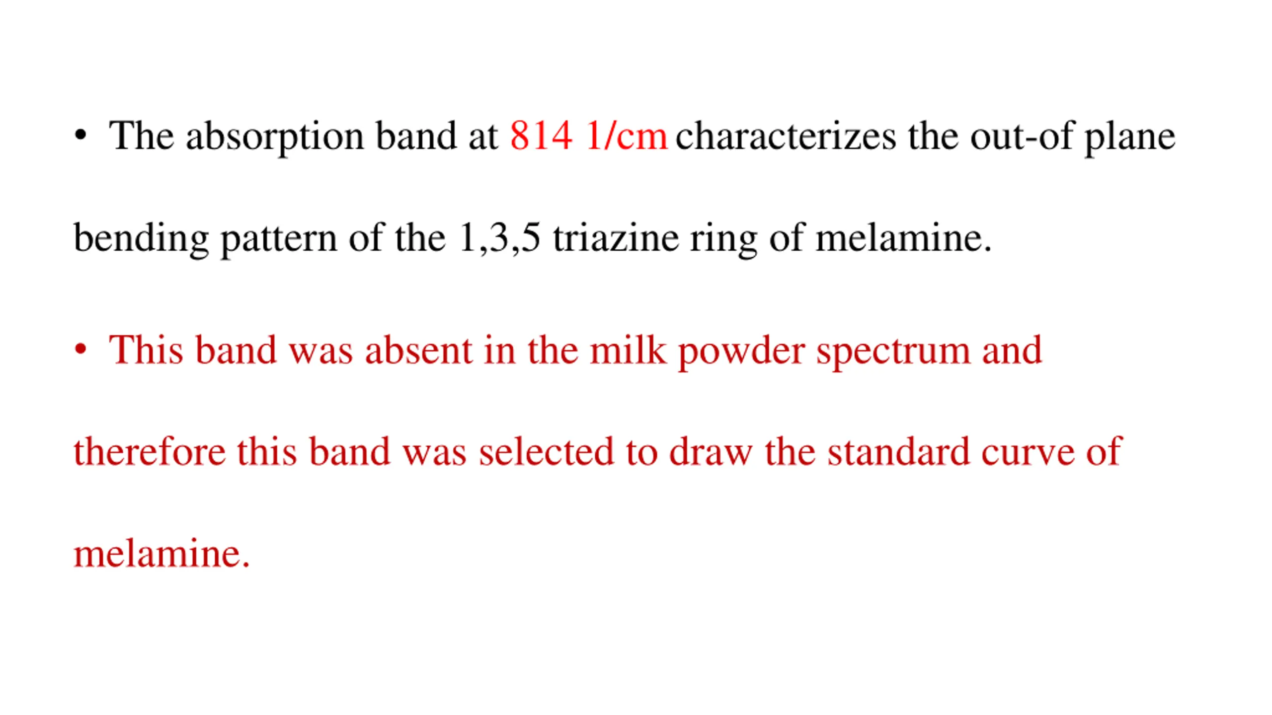 The absorption band at 814 1/cmcharacterizes the out-of plane bending pattern of the 1,3,5 triazine ring of melamine. This band was absent in the milk powder spectrum and therefore this band was selected to draw the standard curve of melamine.