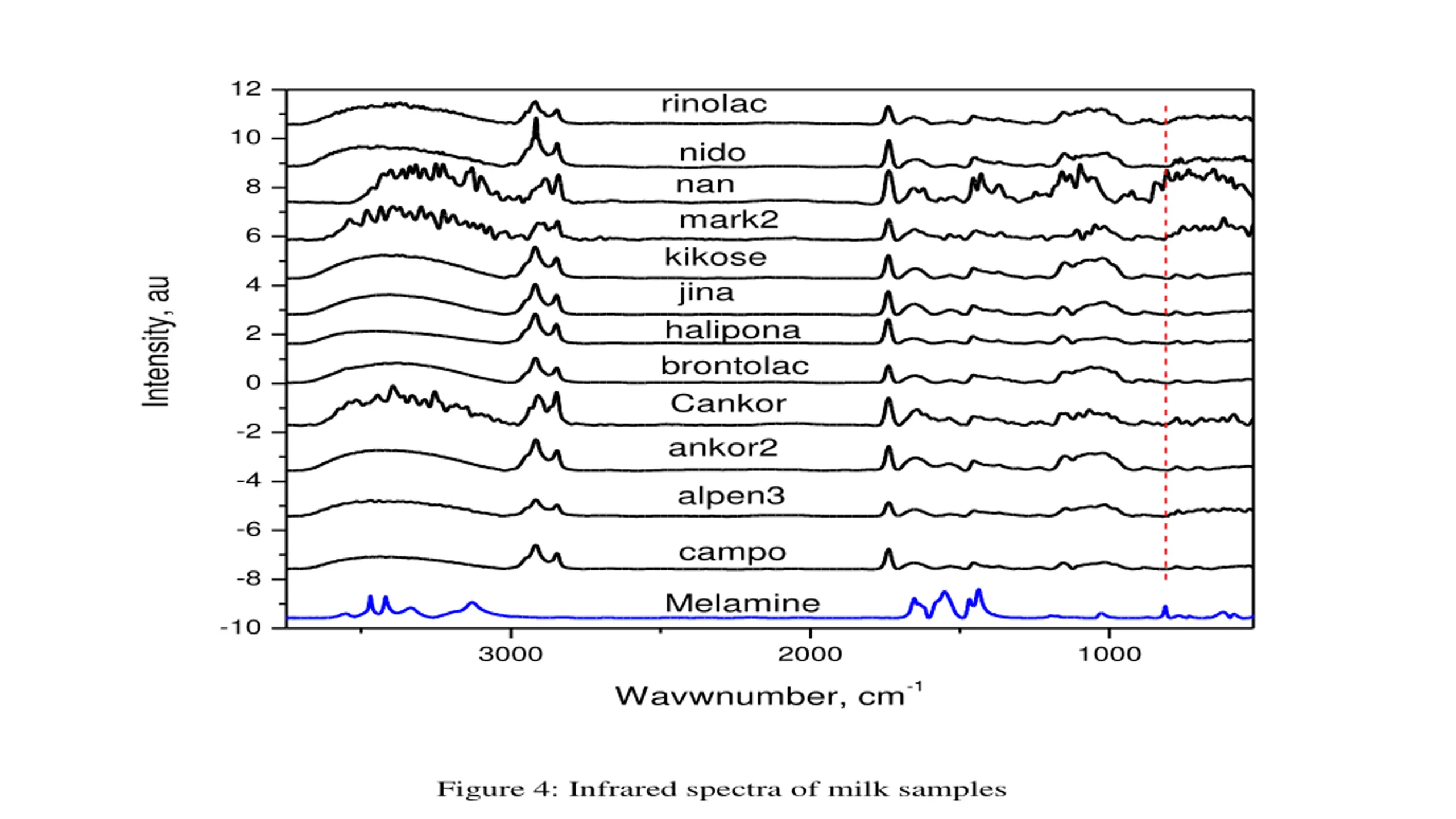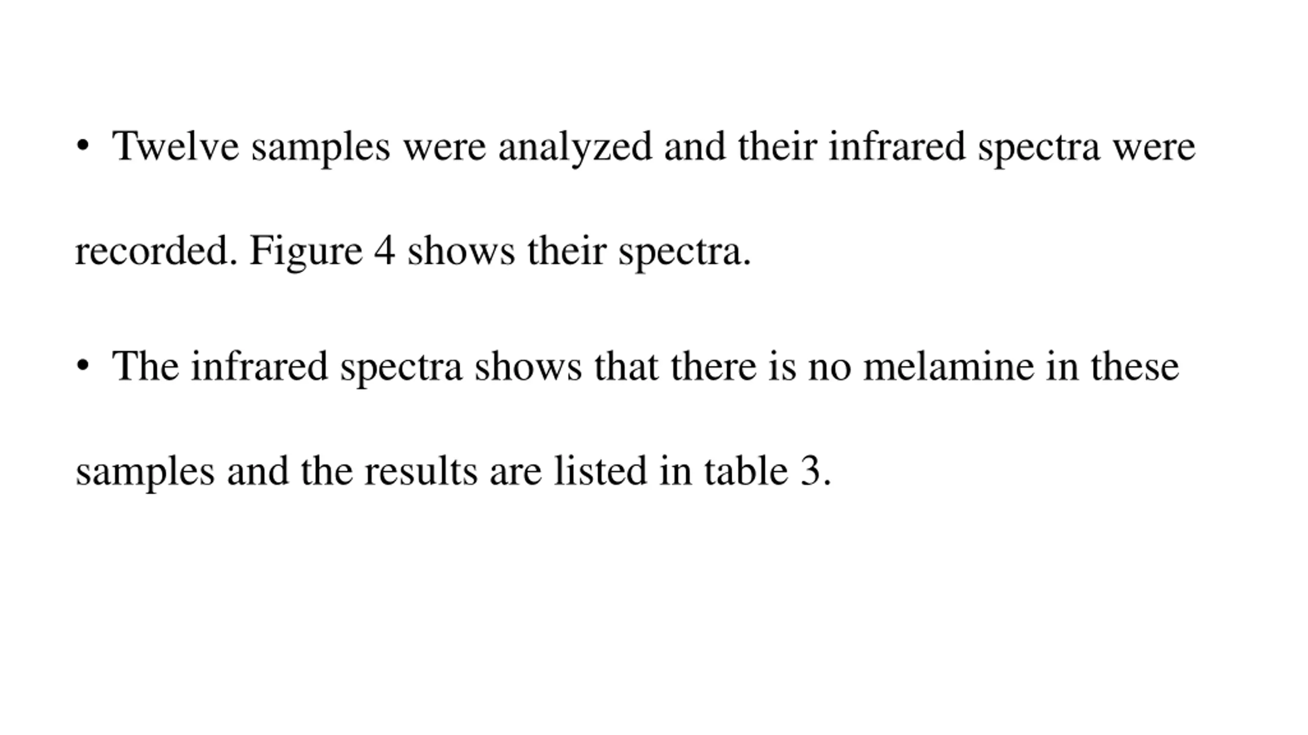 Twelve samples were analyzed and their infrared spectra were recorded. Figure 4 shows their spectra. The infrared spectra shows that there is no melamine in these samples and the results are listed in table 3.