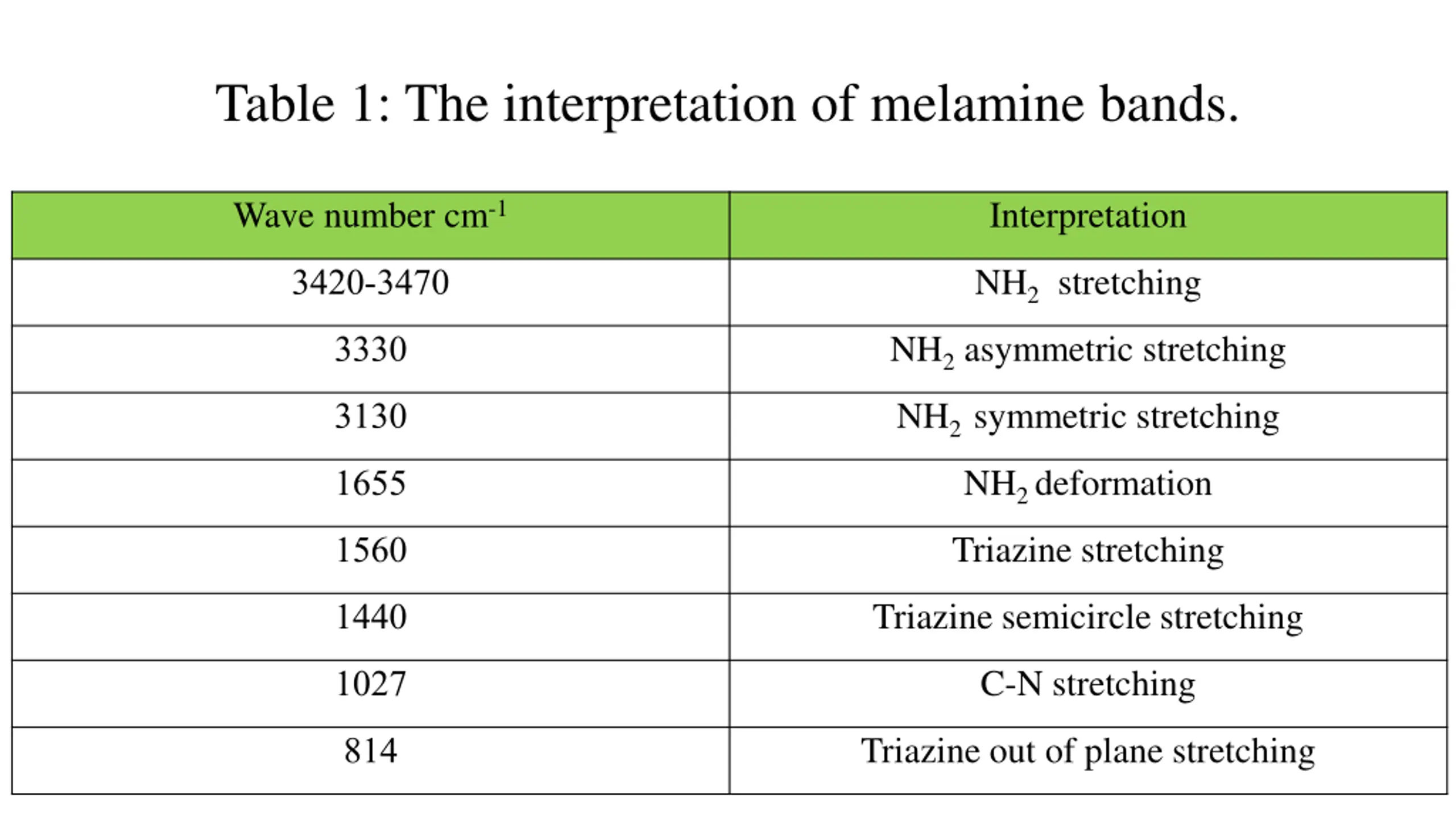 Table 1: The interpretation of melamine bands. Wave number cm-1 Interpretation NH2 stretching 3420 - 3470 NH2 asymmetric stretching 3330 NH2 symmetric stretching 3130 NH2 deformation 1655 Triazine stretching 1560 Triazine semicircle stretching 1440 C-N stretching 1027 Triazine out of plane stretching 814