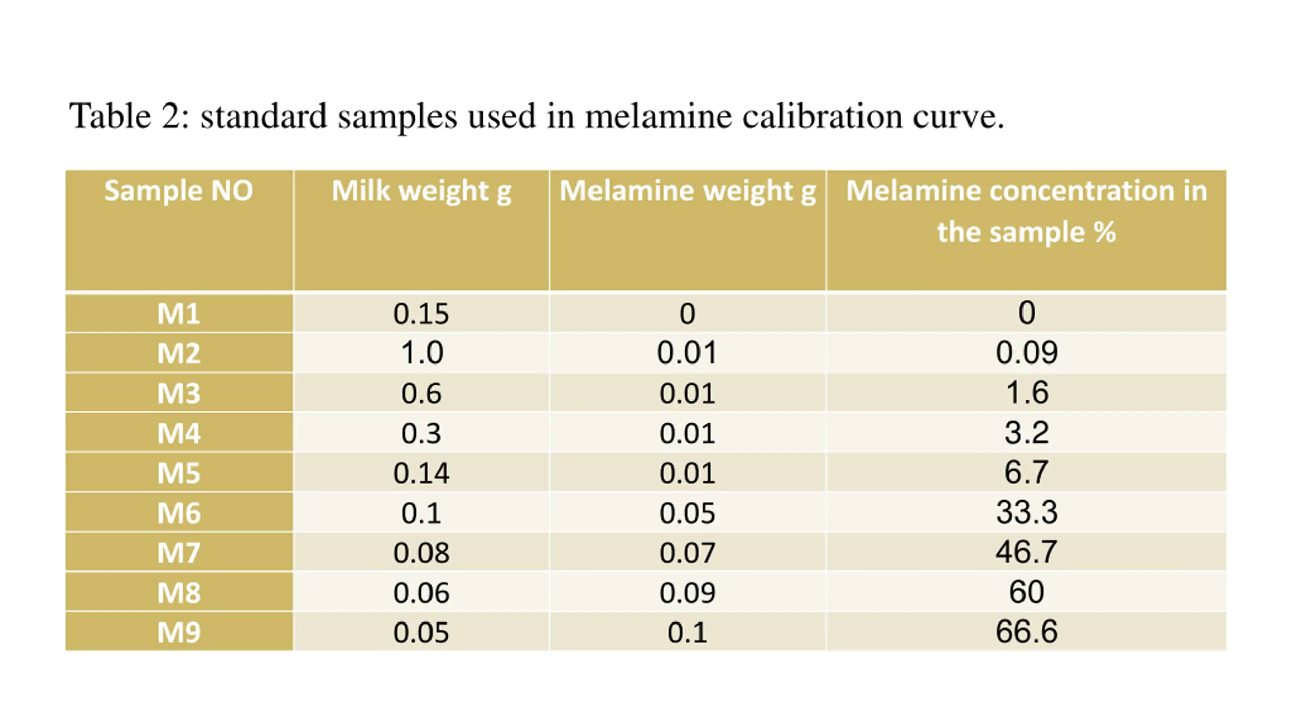 Table 2: standard samples used in melamine calibration curve. Sample NO Milk weight g Melamine weight g Melamine concentration in the sample % 0 M1 M2 M3 M4 M5 M6 M7 M8 M9 0.15 1.0 0.6 0.3 0.14 0.1 0.08 0.06 0.05 0 0.01 0.01 0.01 0.01 0.05 0.07 0.09 0.1 0.09 1.6 3.2 6.7 33.3 46.7 60 66.6