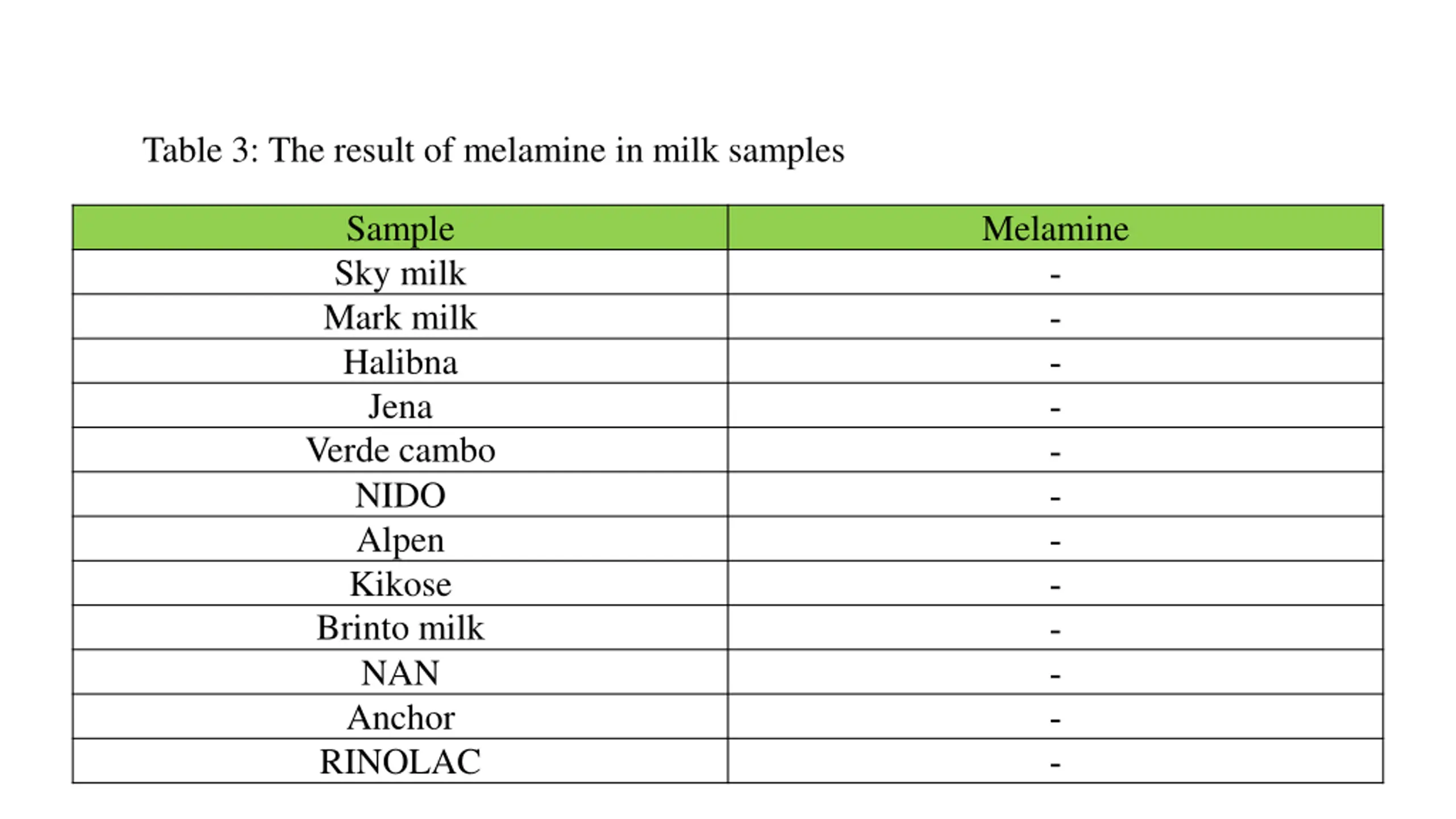 Table 3: The result of melamine in milk samples Sample Sky milk Mark milk Halibna Jena Verde cambo NIDO Alpen Kikose Brinto milk NAN Anchor RINOLAC Melamine - - - - - - - - - - - -