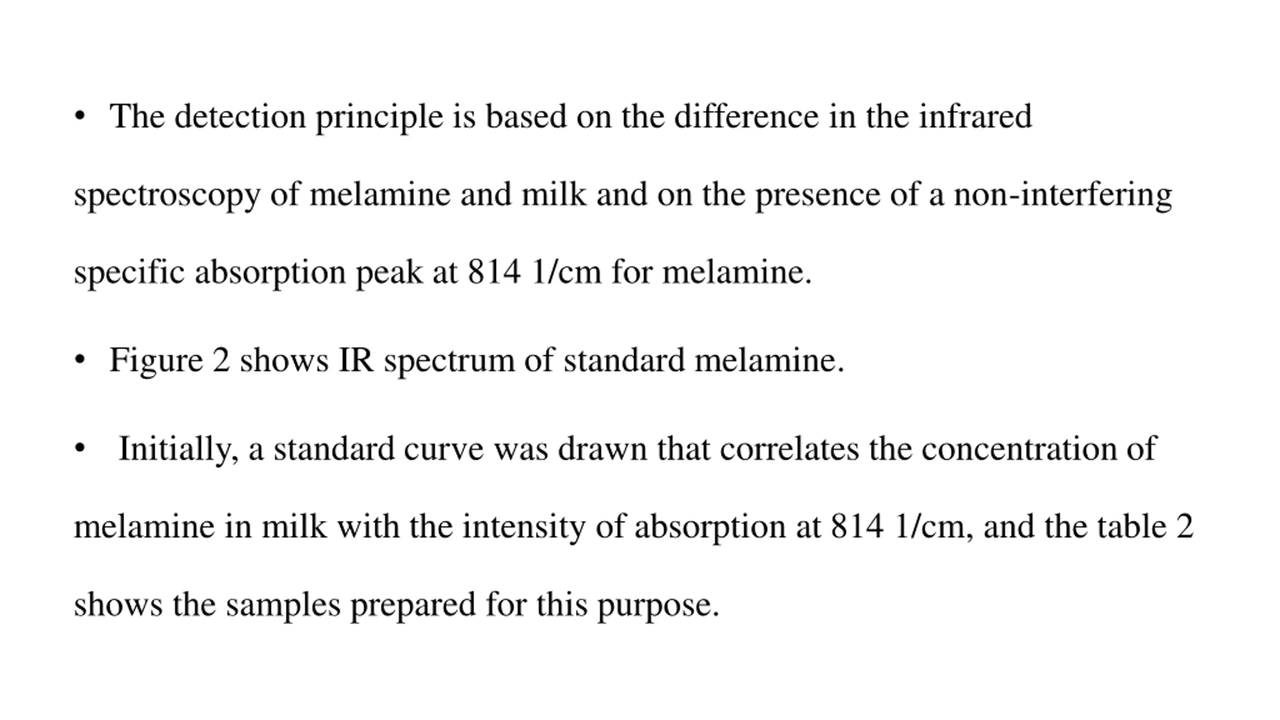 The detection principle is based on the difference in the infrared spectroscopy of melamine and milk and on the presence of a non-interfering specific absorption peak at 814 1/cm for melamine. Figure 2 shows IR spectrum of standard melamine. Initially, a standard curve was drawn that correlates the concentration of melamine in milk with the intensity of absorption at 814 1/cm, and the table 2 shows the samples prepared for this purpose.