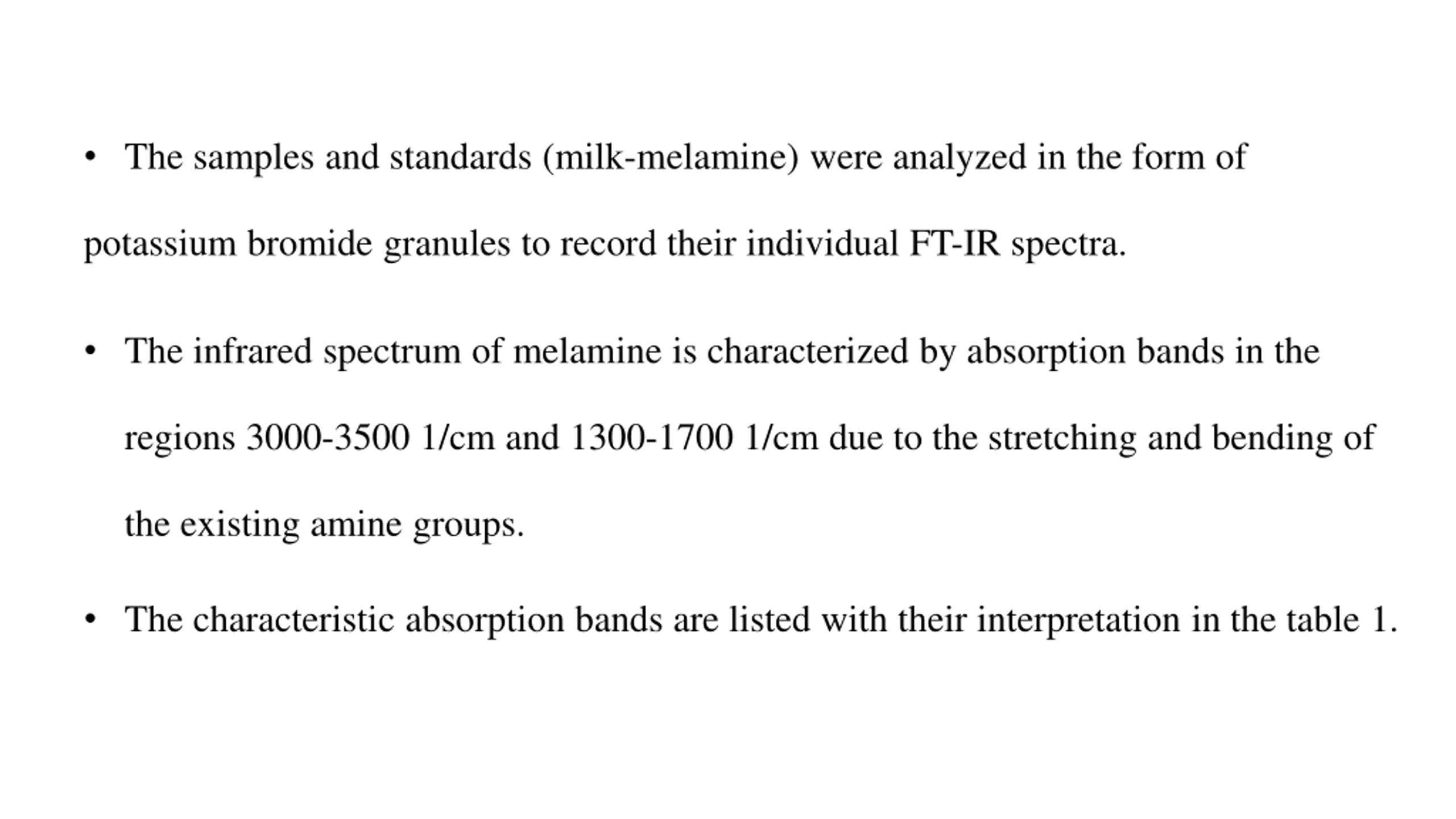The samples and standards (milk-melamine) were analyzed in the form of potassium bromide granules to record their individual FT-IR spectra. The infrared spectrum of melamine is characterized by absorption bands in the regions 3000-3500 1/cm and 1300-1700 1/cm due to the stretching and bending of the existing amine groups. The characteristic absorption bands are listed with their interpretation in the table 1.