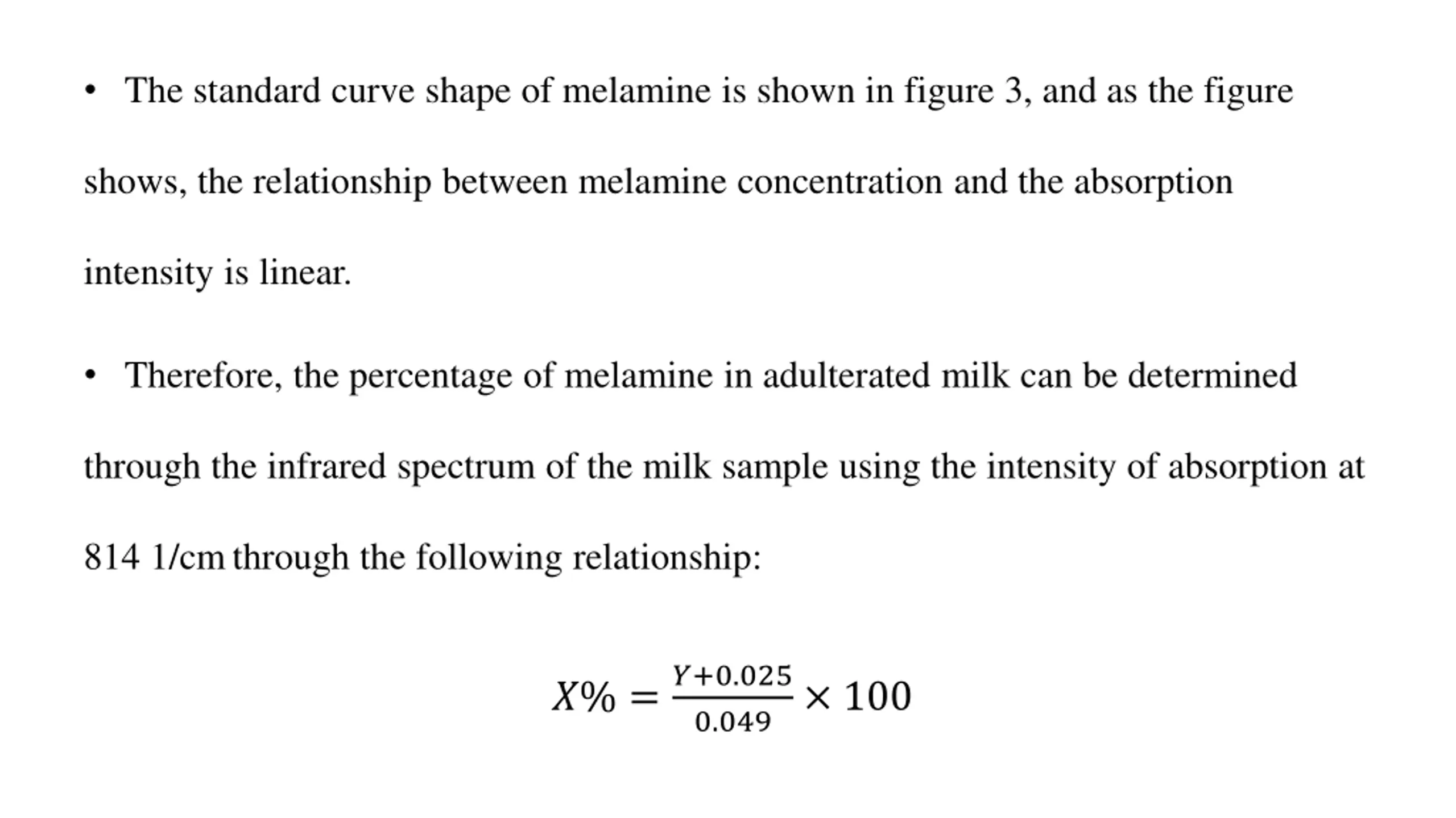 The standard curve shape of melamine is shown in figure 3, and as the figure shows, the relationship between melamine concentration and the absorption intensity is linear. Therefore, the percentage of melamine in adulterated milk can be determined through the infrared spectrum of the milk sample using the intensity of absorption at 814 1/cmthrough the following relationship: ?% =?+0.025 0.049 100
