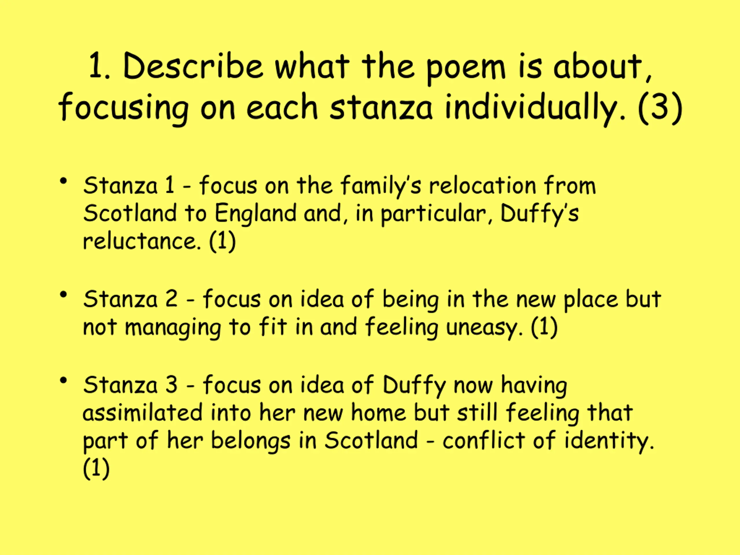 1. Describe what the poem is about, focusing on each stanza individually. (3) Stanza 1 - focus on the family s relocation from Scotland to England and, in particular, Duffy s reluctance. (1) Stanza 2 - focus on idea of being in the new place but not managing to fit in and feeling uneasy. (1) Stanza 3 - focus on idea of Duffy now having assimilated into her new home but still feeling that part of her belongs in Scotland - conflict of identity. (1)