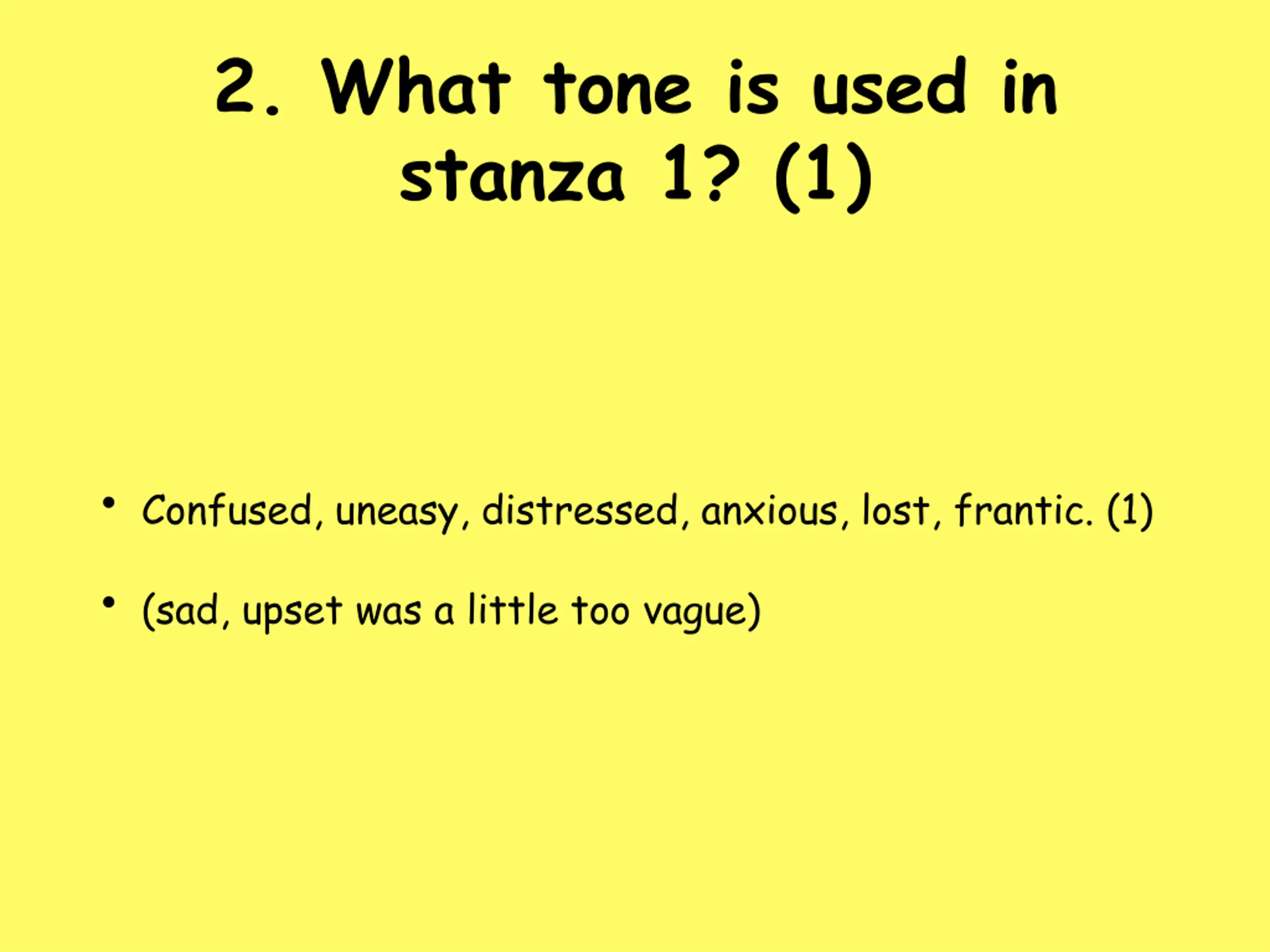 2. What tone is used in stanza 1? (1) Confused, uneasy, distressed, anxious, lost, frantic. (1) (sad, upset was a little too vague)