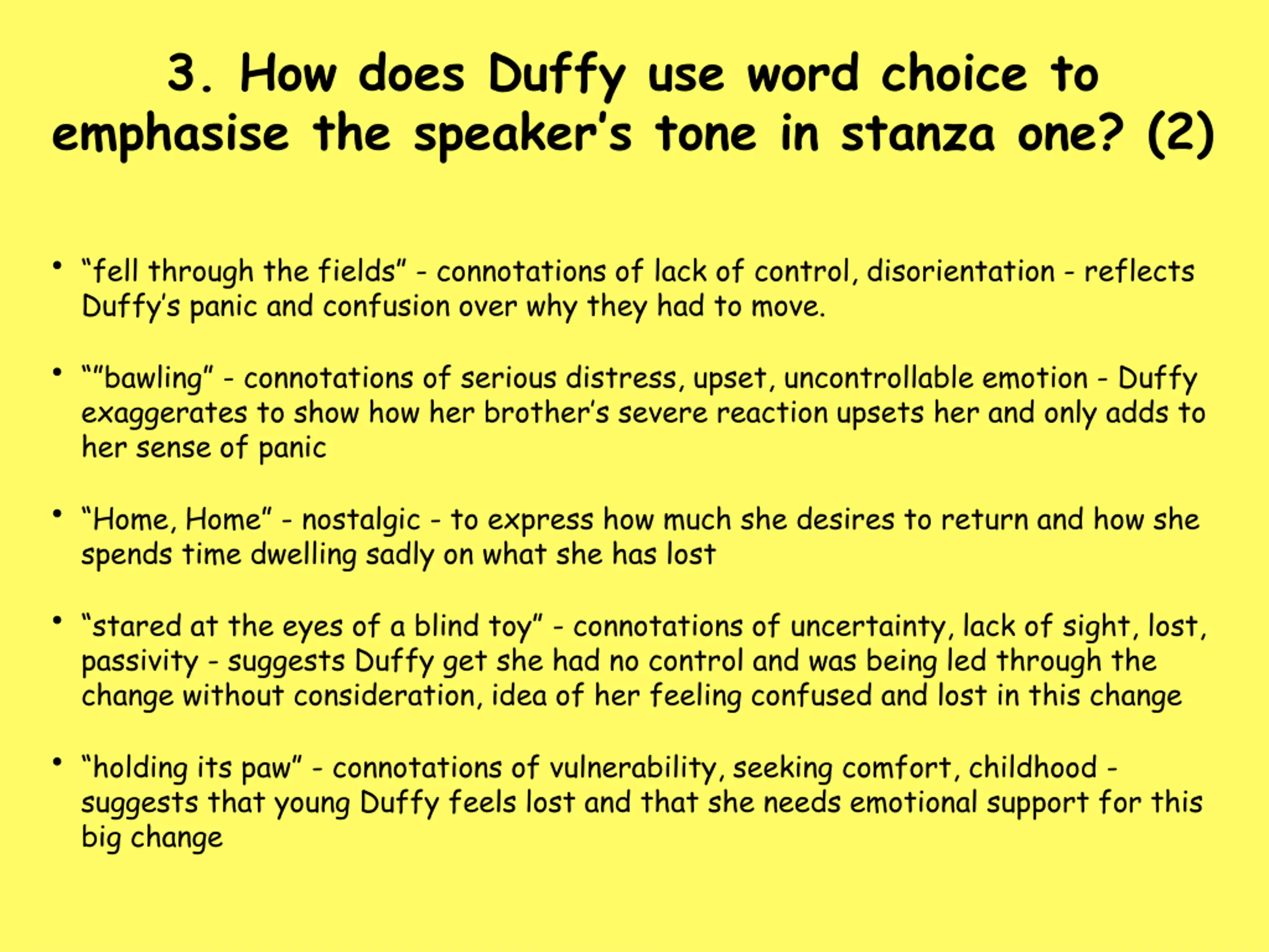 3. How does Duffy use word choice to emphasise the speaker s tone in stanza one? (2) fell through the fields - connotations of lack of control, disorientation - reflects Duffy s panic and confusion over why they had to move. bawling - connotations of serious distress, upset, uncontrollable emotion - Duffy exaggerates to show how her brother s severe reaction upsets her and only adds to her sense of panic Home, Home - nostalgic - to express how much she desires to return and how she spends time dwelling sadly on what she has lost stared at the eyes of a blind toy - connotations of uncertainty, lack of sight, lost, passivity - suggests Duffy get she had no control and was being led through the change without consideration, idea of her feeling confused and lost in this change holding its paw - connotations of vulnerability, seeking comfort, childhood - suggests that young Duffy feels lost and that she needs emotional support for this big change