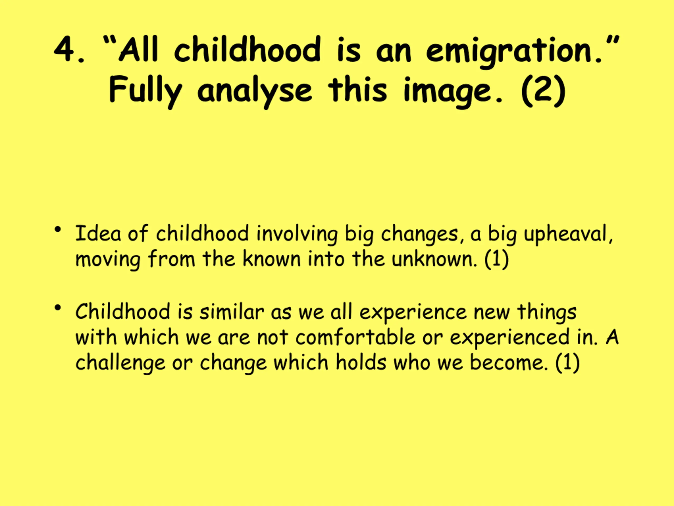 4. All childhood is an emigration. Fully analyse this image. (2) Idea of childhood involving big changes, a big upheaval, moving from the known into the unknown. (1) Childhood is similar as we all experience new things with which we are not comfortable or experienced in. A challenge or change which holds who we become. (1)
