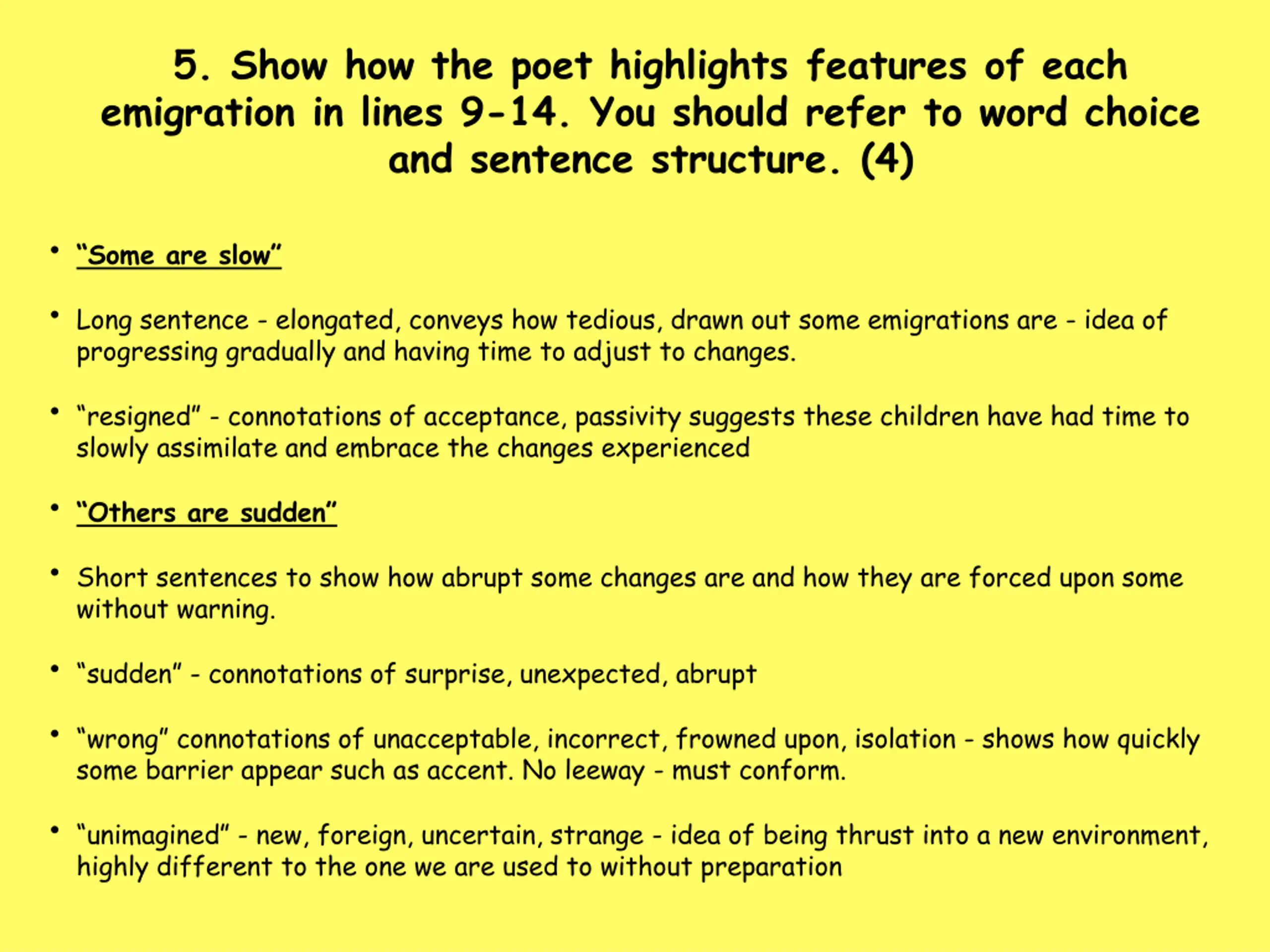 5. Show how the poet highlights features of each emigration in lines 9-14. You should refer to word choice and sentence structure. (4) Some are slow Long sentence - elongated, conveys how tedious, drawn out some emigrations are - idea of progressing gradually and having time to adjust to changes. resigned - connotations of acceptance, passivity suggests these children have had time to slowly assimilate and embrace the changes experienced Others are sudden Short sentences to show how abrupt some changes are and how they are forced upon some without warning. sudden - connotations of surprise, unexpected, abrupt wrong connotations of unacceptable, incorrect, frowned upon, isolation - shows how quickly some barrier appear such as accent. No leeway - must conform. unimagined - new, foreign, uncertain, strange - idea of being thrust into a new environment, highly different to the one we are used to without preparation