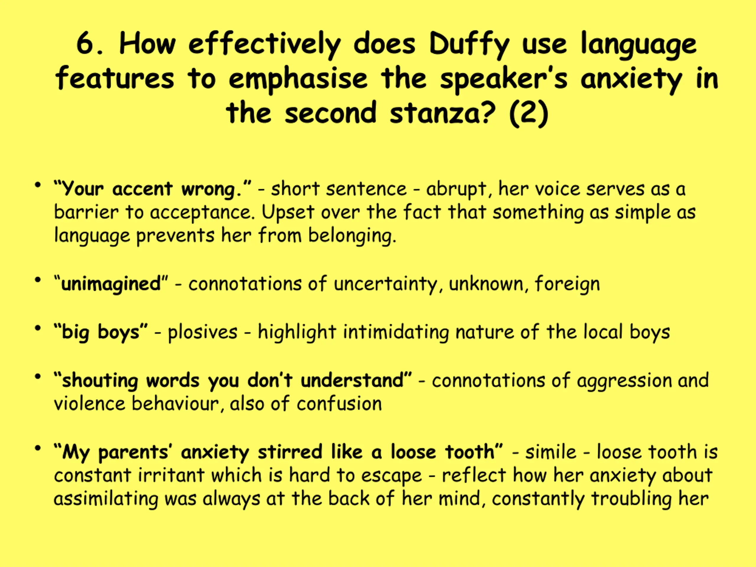 6. How effectively does Duffy use language features to emphasise the speaker s anxiety in the second stanza? (2) Your accent wrong. - short sentence - abrupt, her voice serves as a barrier to acceptance. Upset over the fact that something as simple as language prevents her from belonging. unimagined - connotations of uncertainty, unknown, foreign big boys - plosives - highlight intimidating nature of the local boys shouting words you don t understand - connotations of aggression and violence behaviour, also of confusion My parents anxiety stirred like a loose tooth - simile - loose tooth is constant irritant which is hard to escape - reflect how her anxiety about assimilating was always at the back of her mind, constantly troubling her