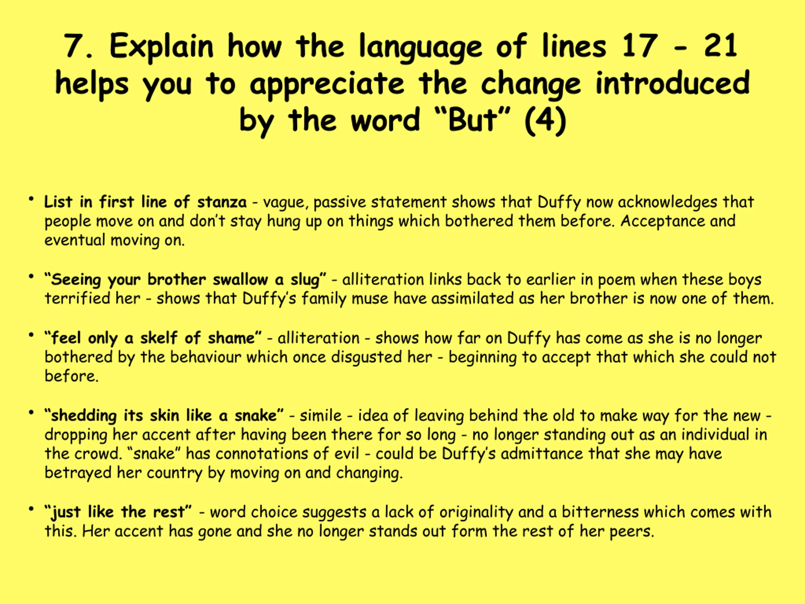7. Explain how the language of lines 17 - 21 helps you to appreciate the change introduced by the word But (4) List in first line of stanza - vague, passive statement shows that Duffy now acknowledges that people move on and don t stay hung up on things which bothered them before. Acceptance and eventual moving on. Seeing your brother swallow a slug - alliteration links back to earlier in poem when these boys terrified her - shows that Duffy s family muse have assimilated as her brother is now one of them. feel only a skelf of shame - alliteration - shows how far on Duffy has come as she is no longer bothered by the behaviour which once disgusted her - beginning to accept that which she could not before. shedding its skin like a snake - simile - idea of leaving behind the old to make way for the new - dropping her accent after having been there for so long - no longer standing out as an individual in the crowd. snake has connotations of evil - could be Duffy s admittance that she may have betrayed her country by moving on and changing. just like the rest - word choice suggests a lack of originality and a bitterness which comes with this. Her accent has gone and she no longer stands out form the rest of her peers.
