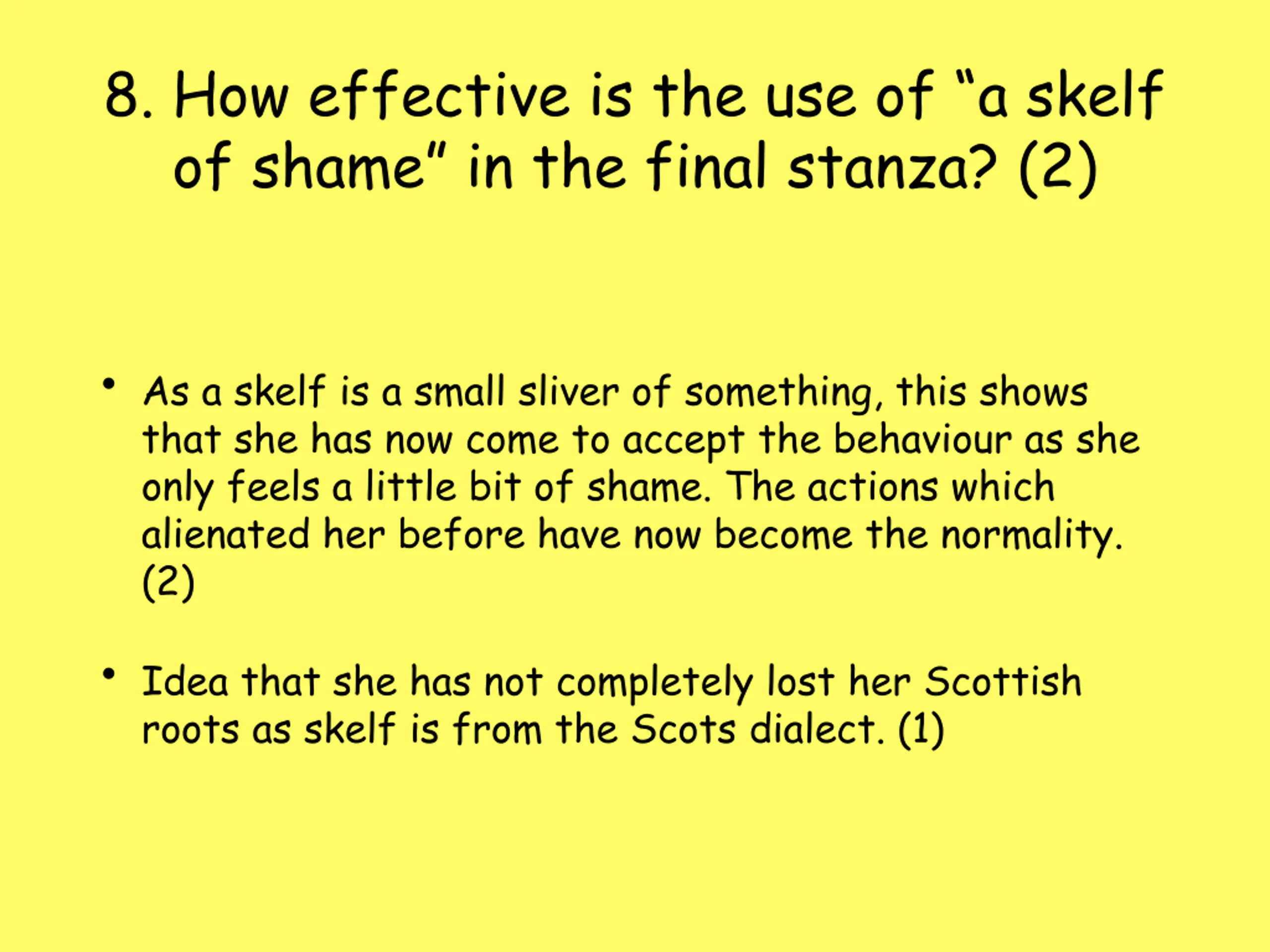 8. How effective is the use of a skelf of shame in the final stanza? (2) As a skelf is a small sliver of something, this shows that she has now come to accept the behaviour as she only feels a little bit of shame. The actions which alienated her before have now become the normality. (2) Idea that she has not completely lost her Scottish roots as skelf is from the Scots dialect. (1)