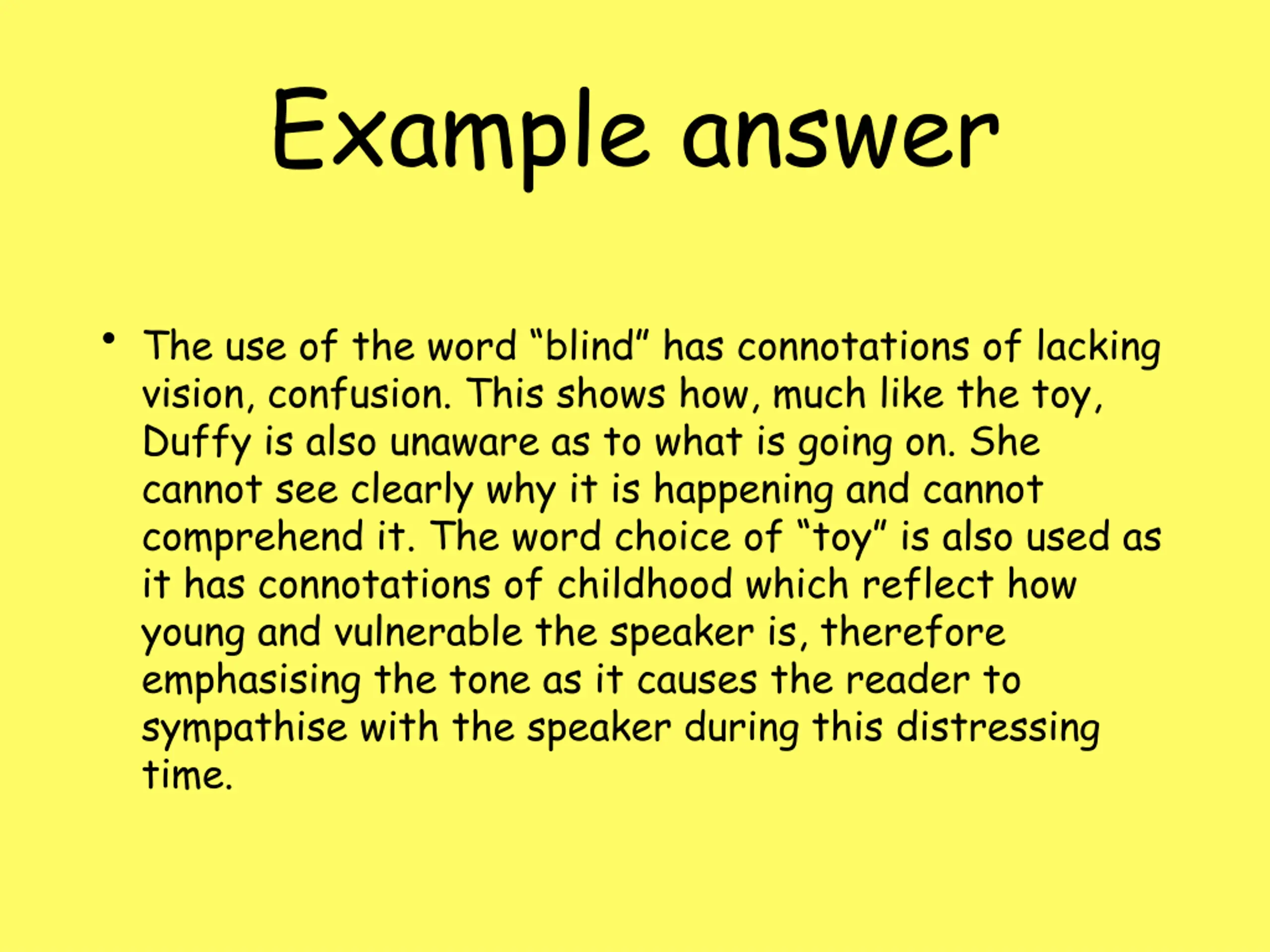 Example answer The use of the word blind has connotations of lacking vision, confusion. This shows how, much like the toy, Duffy is also unaware as to what is going on. She cannot see clearly why it is happening and cannot comprehend it. The word choice of toy is also used as it has connotations of childhood which reflect how young and vulnerable the speaker is, therefore emphasising the tone as it causes the reader to sympathise with the speaker during this distressing time.
