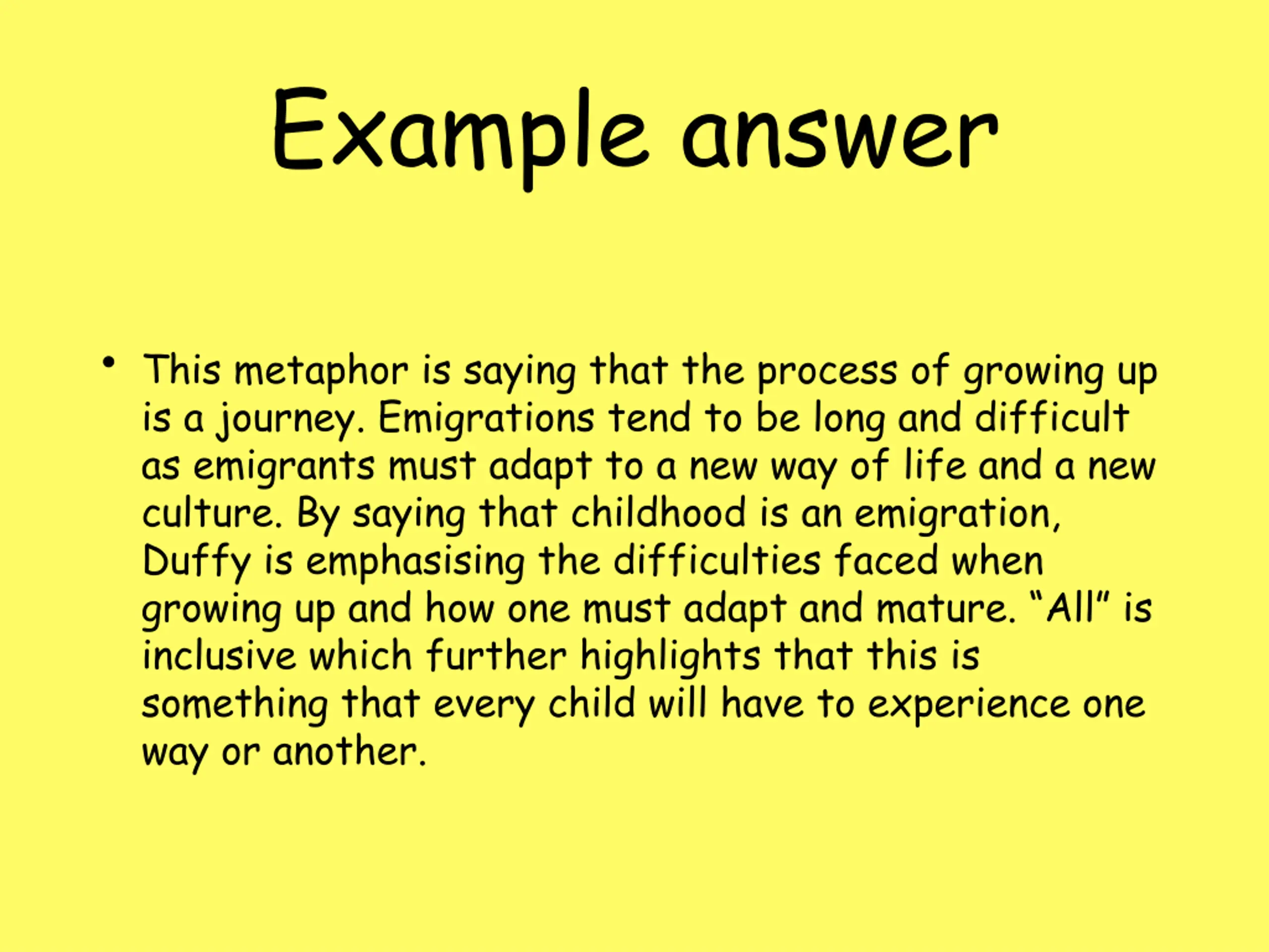 Example answer This metaphor is saying that the process of growing up is a journey. Emigrations tend to be long and difficult as emigrants must adapt to a new way of life and a new culture. By saying that childhood is an emigration, Duffy is emphasising the difficulties faced when growing up and how one must adapt and mature. All is inclusive which further highlights that this is something that every child will have to experience one way or another.
