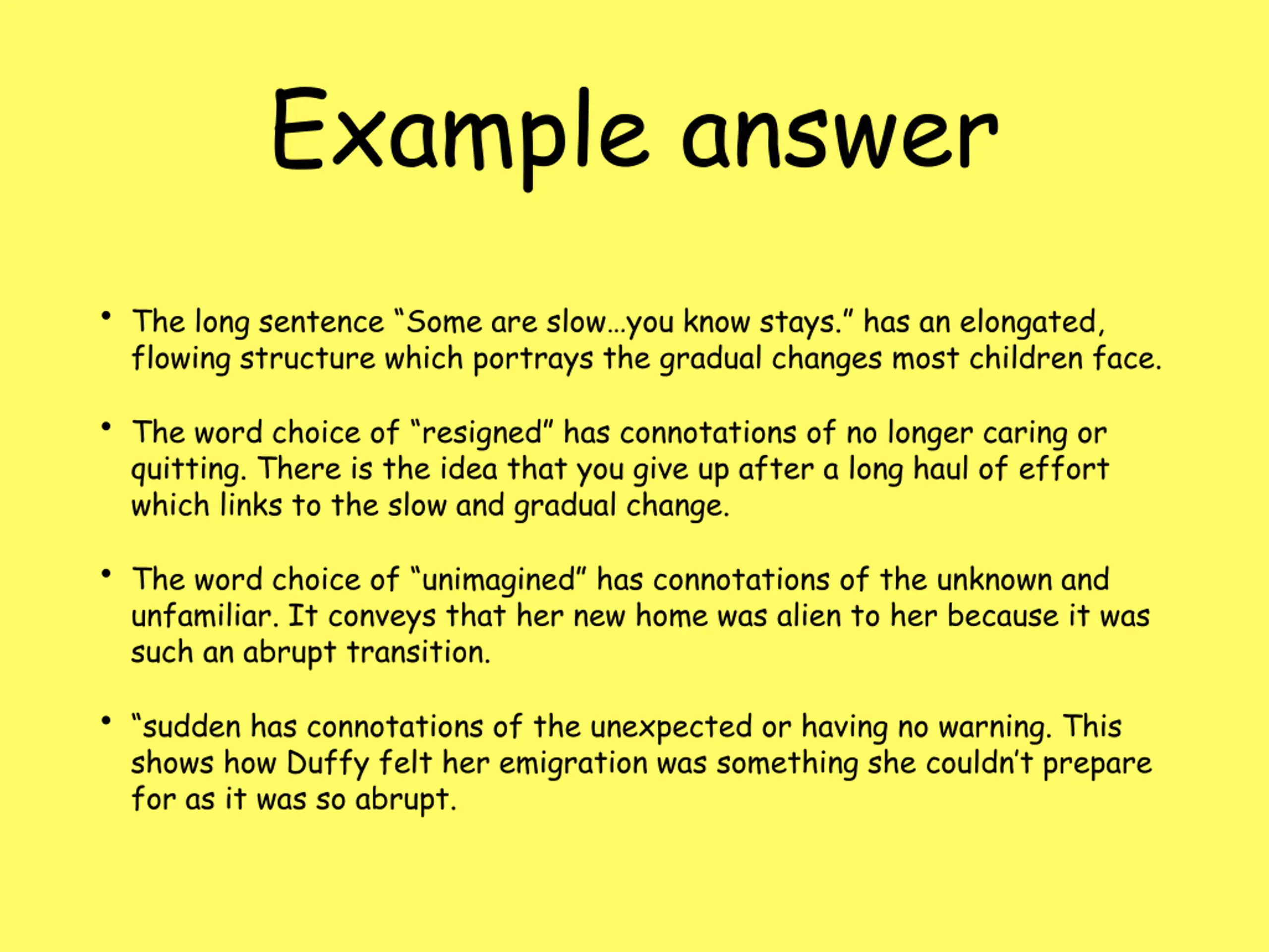 Example answer The long sentence Some are slow you know stays. has an elongated, flowing structure which portrays the gradual changes most children face. The word choice of resigned has connotations of no longer caring or quitting. There is the idea that you give up after a long haul of effort which links to the slow and gradual change. The word choice of unimagined has connotations of the unknown and unfamiliar. It conveys that her new home was alien to her because it was such an abrupt transition. sudden has connotations of the unexpected or having no warning. This shows how Duffy felt her emigration was something she couldn t prepare for as it was so abrupt.