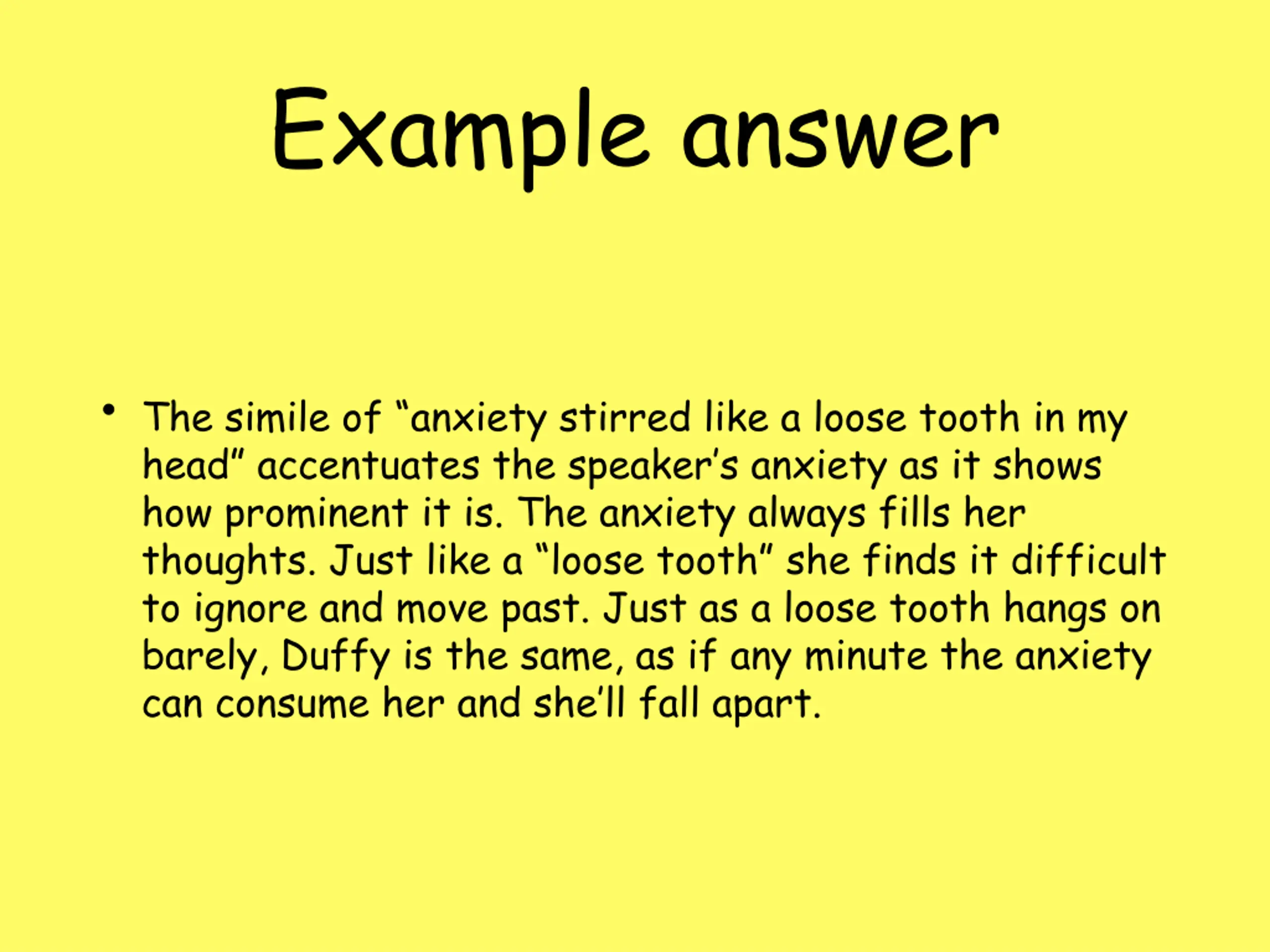 Example answer The simile of anxiety stirred like a loose tooth in my head accentuates the speaker s anxiety as it shows how prominent it is. The anxiety always fills her thoughts. Just like a loose tooth she finds it difficult to ignore and move past. Just as a loose tooth hangs on barely, Duffy is the same, as if any minute the anxiety can consume her and she ll fall apart.