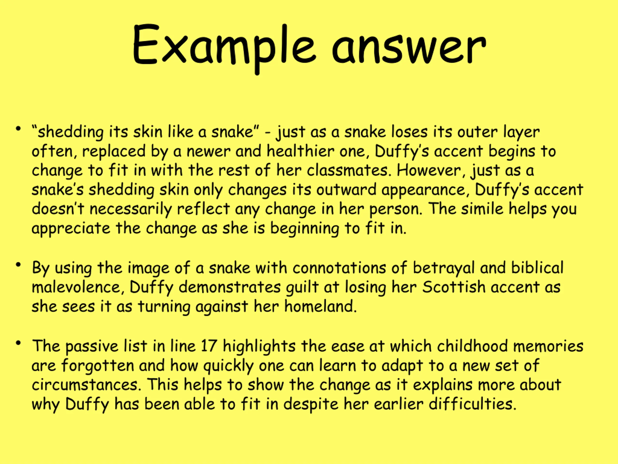 Example answer shedding its skin like a snake - just as a snake loses its outer layer often, replaced by a newer and healthier one, Duffy s accent begins to change to fit in with the rest of her classmates. However, just as a snake s shedding skin only changes its outward appearance, Duffy s accent doesn t necessarily reflect any change in her person. The simile helps you appreciate the change as she is beginning to fit in. By using the image of a snake with connotations of betrayal and biblical malevolence, Duffy demonstrates guilt at losing her Scottish accent as she sees it as turning against her homeland. The passive list in line 17 highlights the ease at which childhood memories are forgotten and how quickly one can learn to adapt to a new set of circumstances. This helps to show the change as it explains more about why Duffy has been able to fit in despite her earlier difficulties.