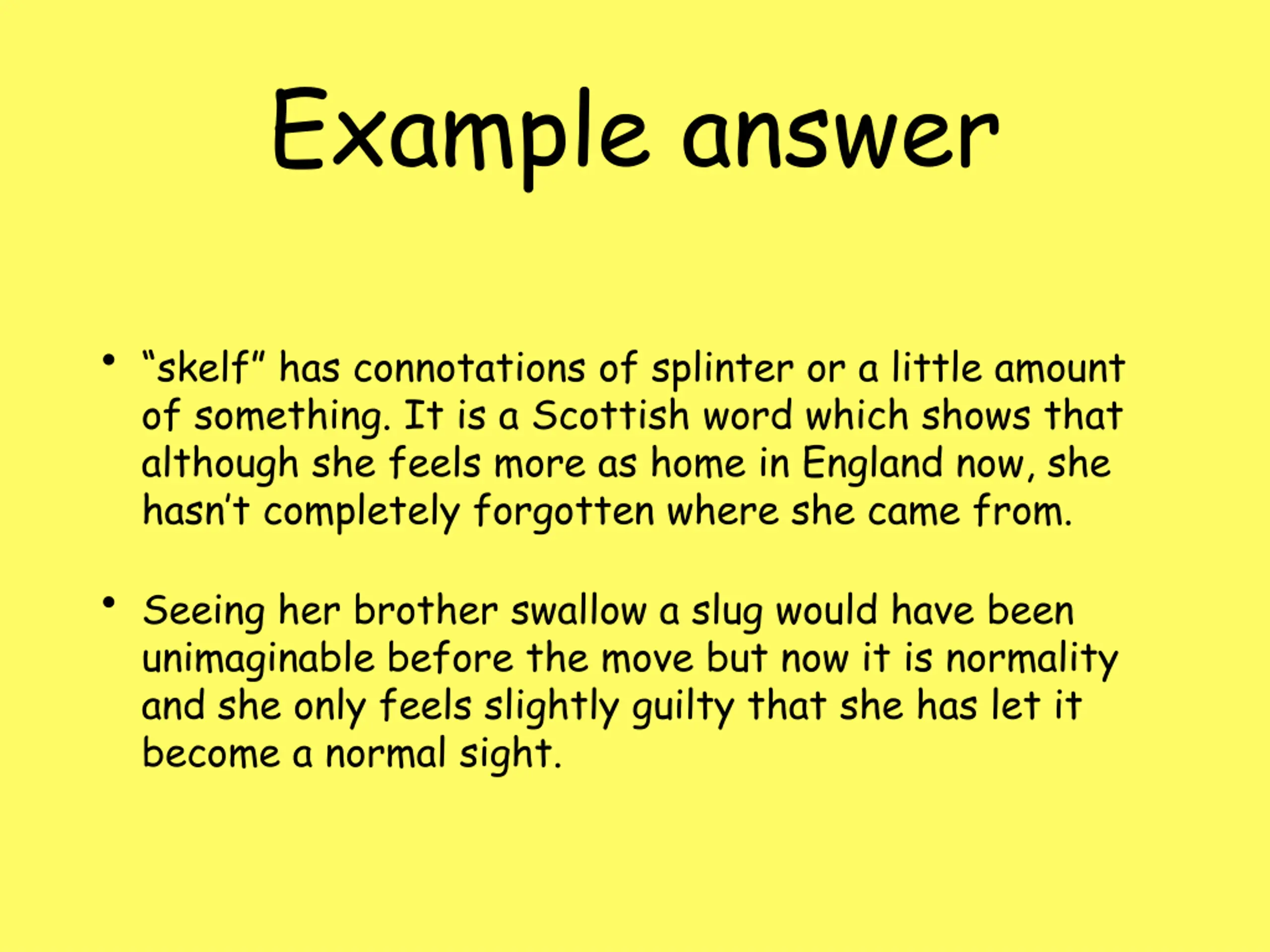 Example answer skelf has connotations of splinter or a little amount of something. It is a Scottish word which shows that although she feels more as home in England now, she hasn t completely forgotten where she came from. Seeing her brother swallow a slug would have been unimaginable before the move but now it is normality and she only feels slightly guilty that she has let it become a normal sight.