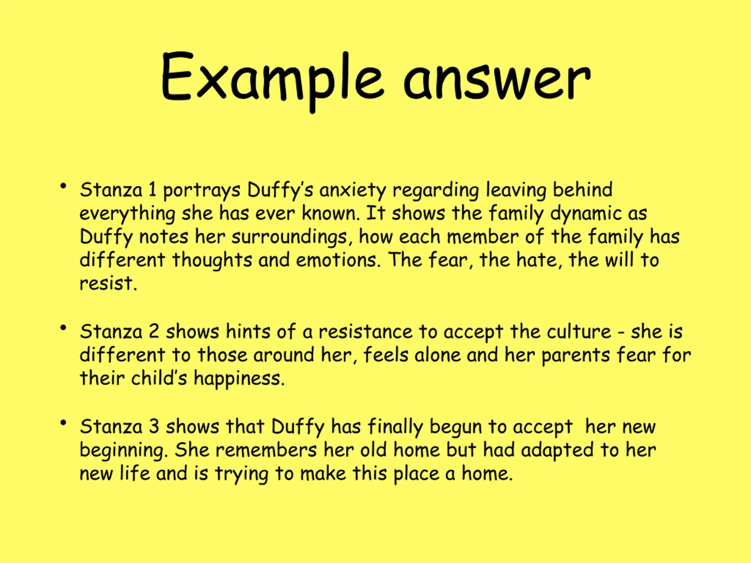 Example answer Stanza 1 portrays Duffy s anxiety regarding leaving behind everything she has ever known. It shows the family dynamic as Duffy notes her surroundings, how each member of the family has different thoughts and emotions. The fear, the hate, the will to resist. Stanza 2 shows hints of a resistance to accept the culture - she is different to those around her, feels alone and her parents fear for their child s happiness. Stanza 3 shows that Duffy has finally begun to accept her new beginning. She remembers her old home but had adapted to her new life and is trying to make this place a home.