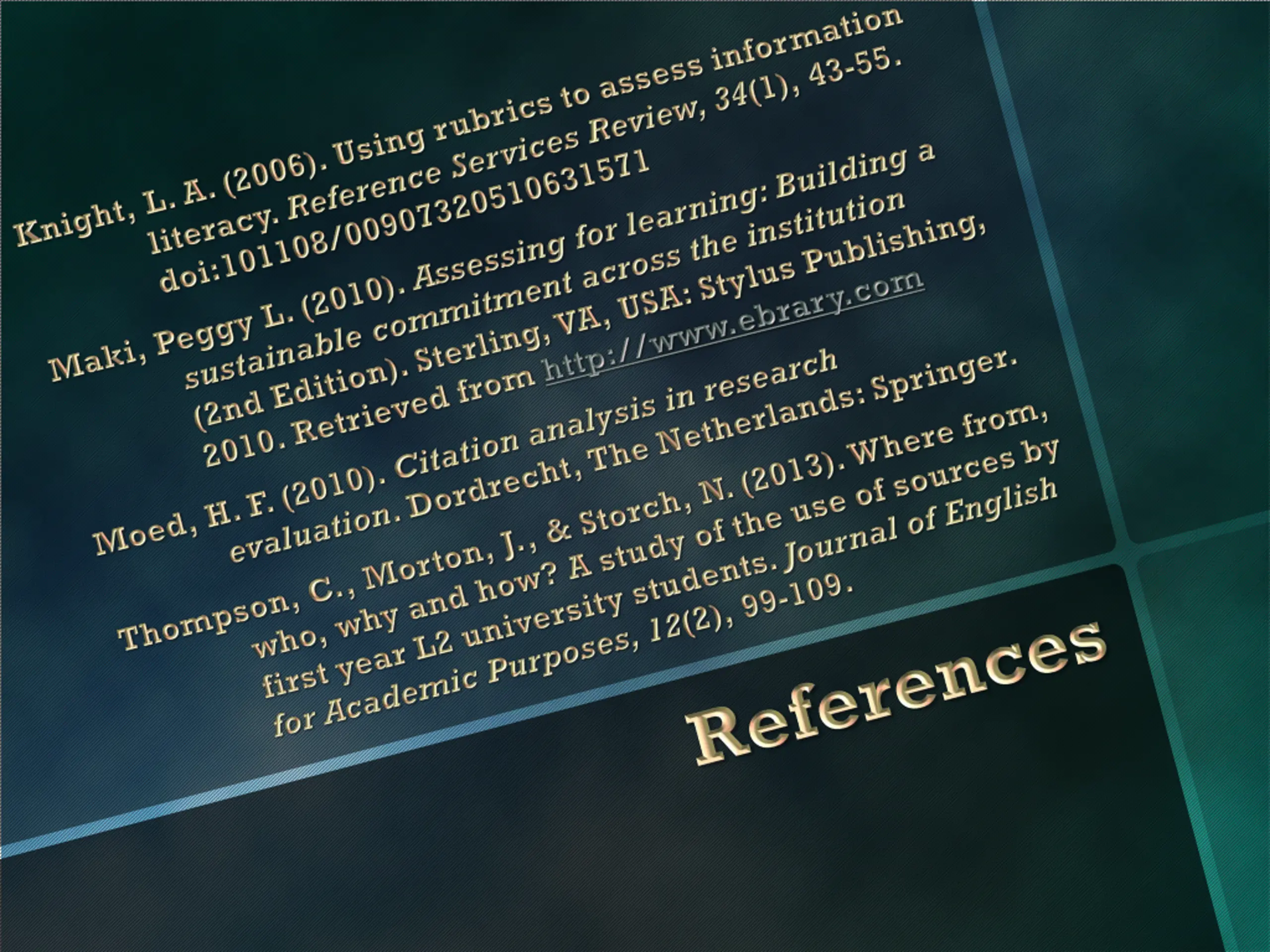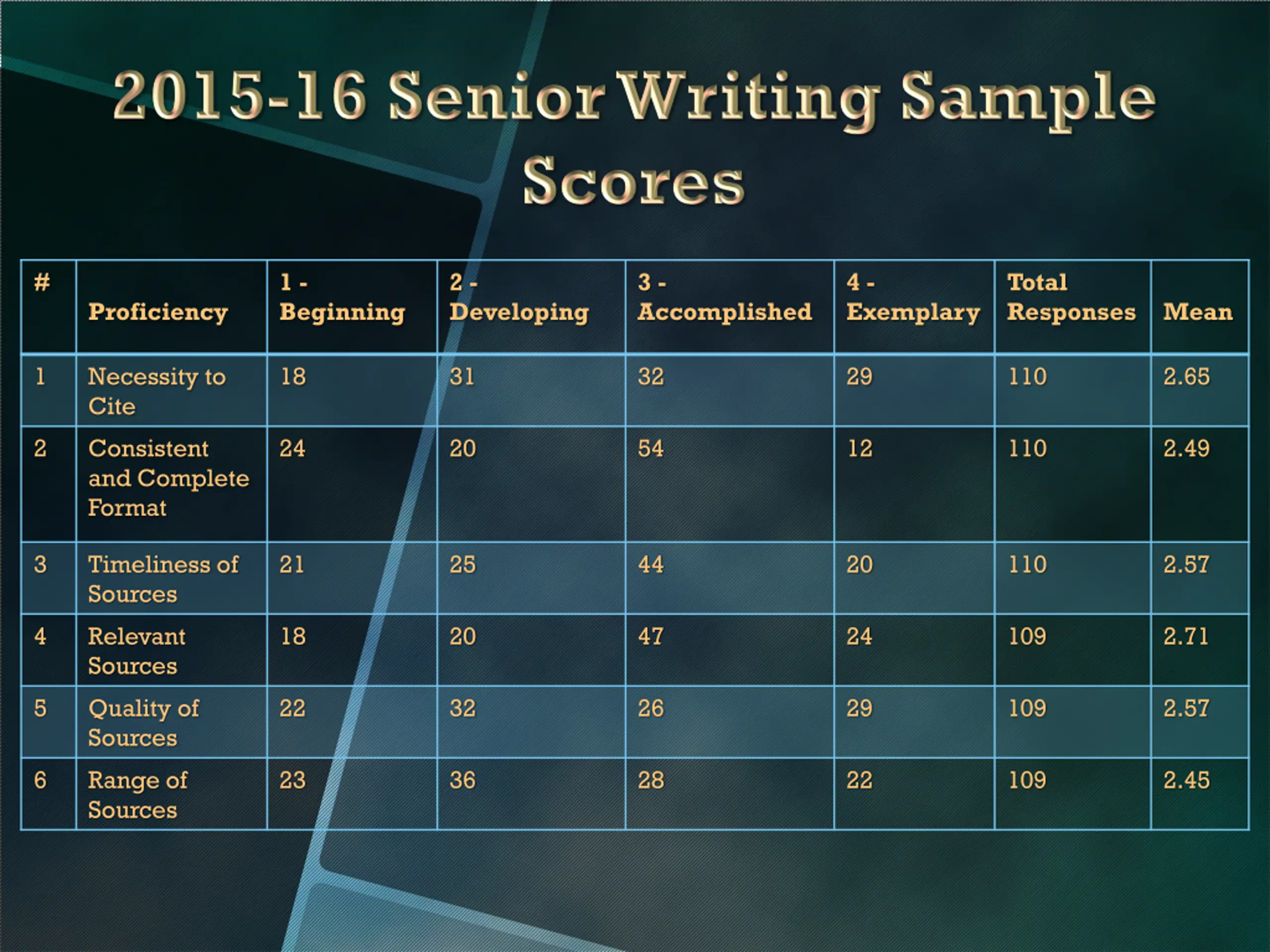 # 1 - Beginning 2 - Developing 3 - Accomplished 4 - Exemplary Total Responses Proficiency Mean 1 Necessity to Cite 18 31 32 29 110 2.65 2 Consistent and Complete Format 24 20 54 12 110 2.49 3 Timeliness of Sources 21 25 44 20 110 2.57 4 Relevant Sources 18 20 47 24 109 2.71 5 Quality of Sources 22 32 26 29 109 2.57 6 Range of Sources 23 36 28 22 109 2.45