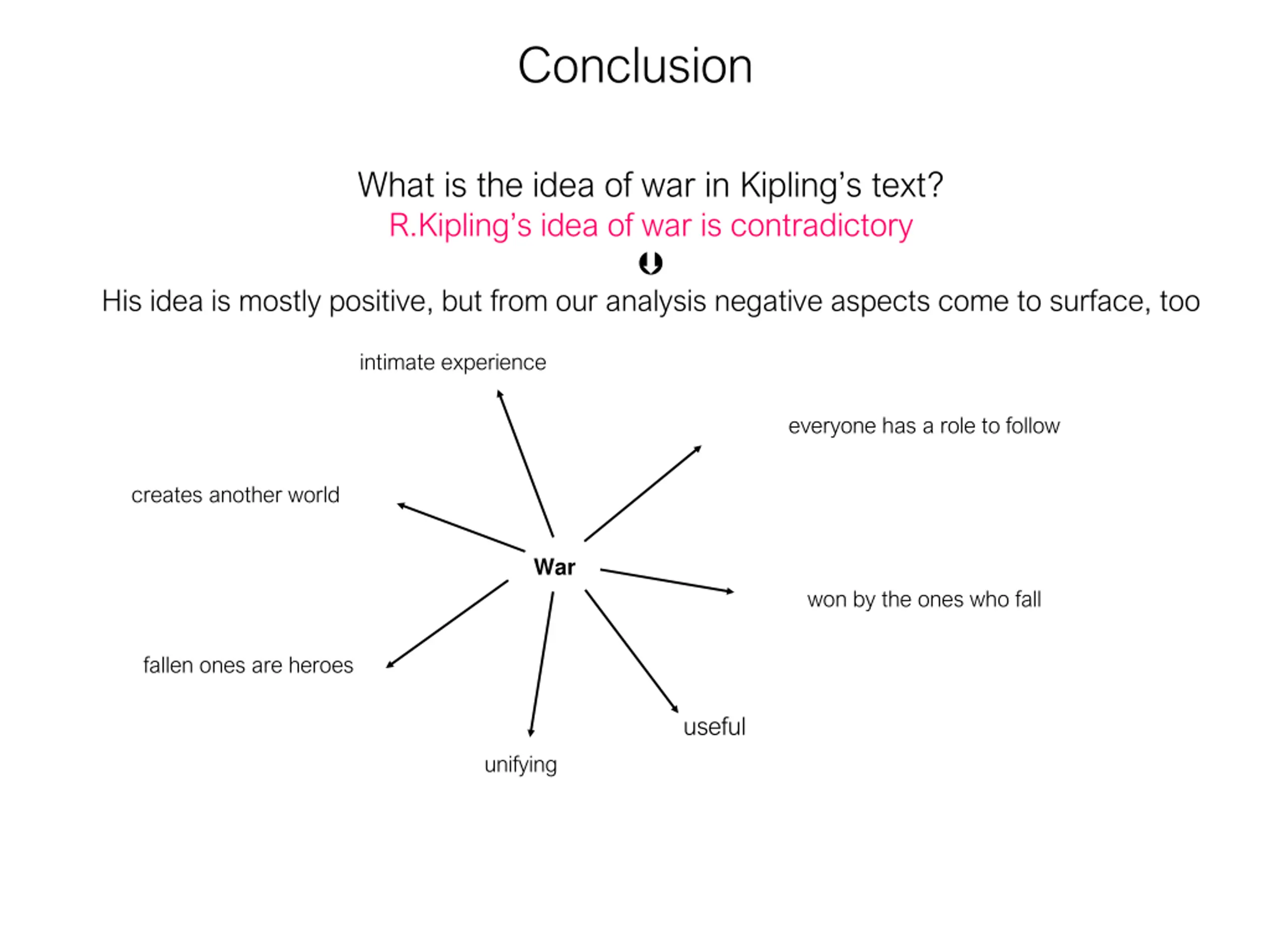 Conclusion What is the idea of war in Kipling s text? R.Kipling s idea of war is contradictory His idea is mostly positive, but from our analysis negative aspects come to surface, too intimate experience everyone has a role to follow creates another world War won by the ones who fall fallen ones are heroes useful unifying