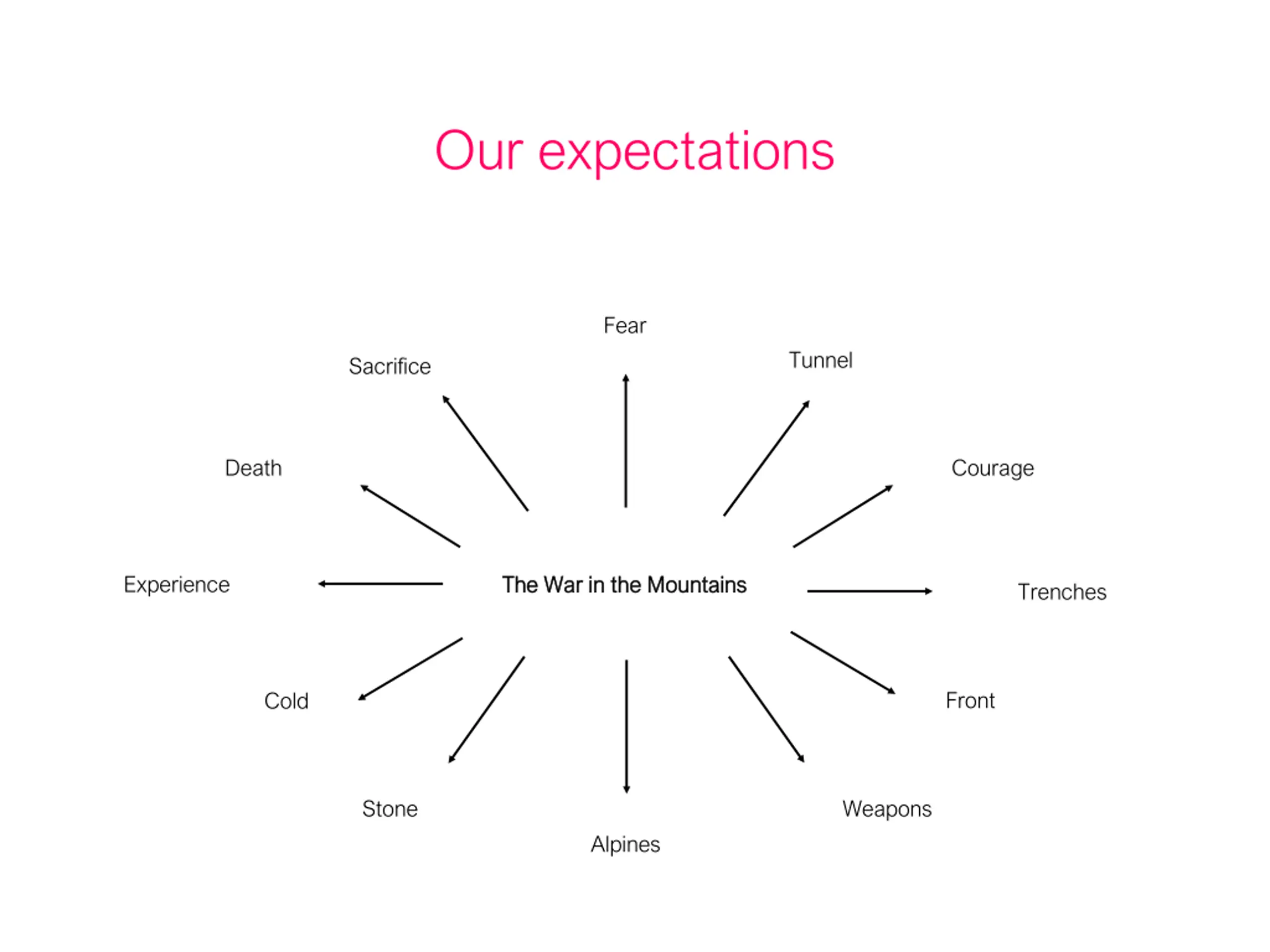 Our expectations Fear Tunnel Sacrifice Death Courage Experience The The W War ar in the in the M Mountains ountains Trenches Front Cold Stone Weapons Alpines