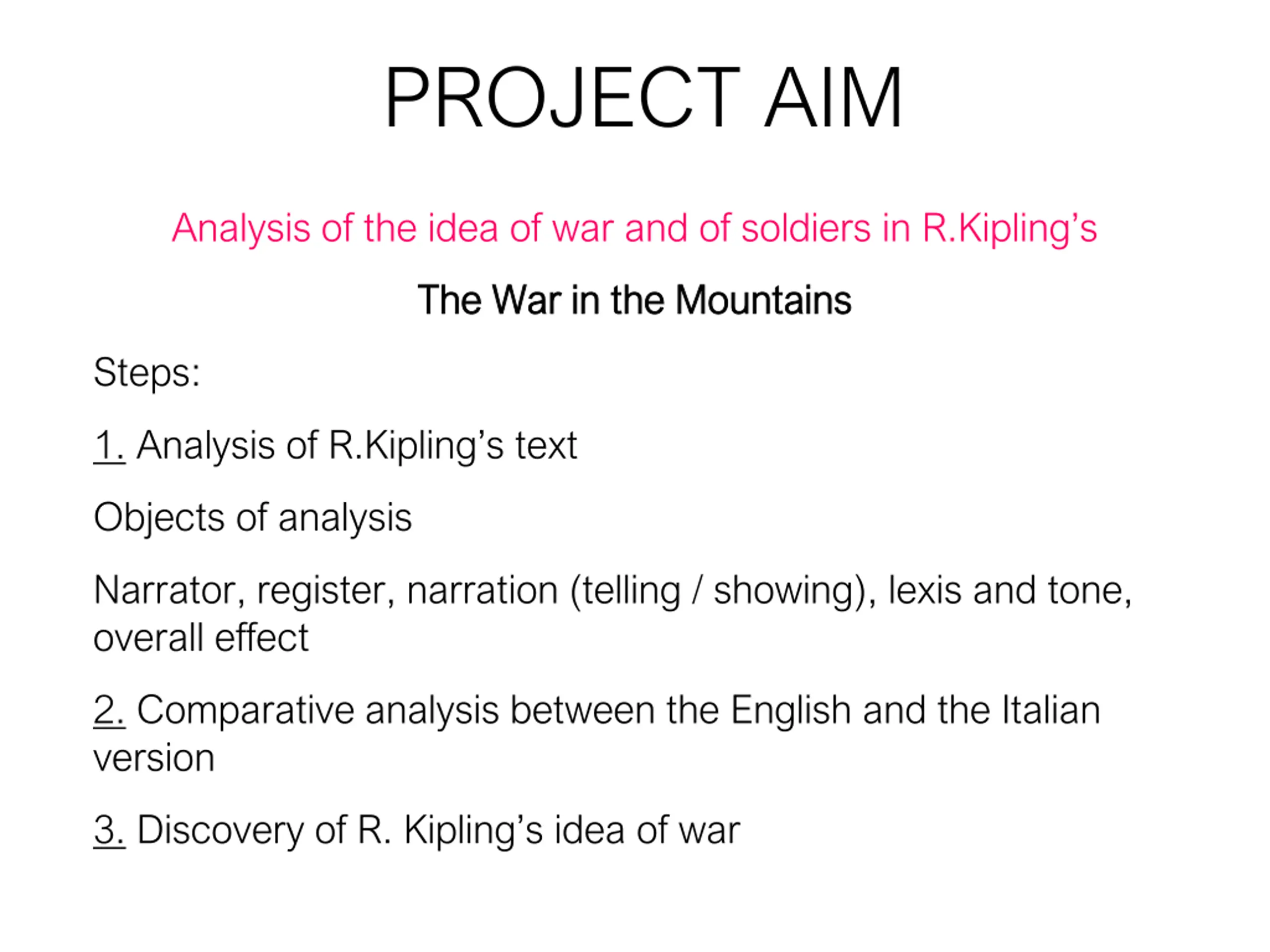 PROJECT AIM Analysis of the idea of war and of soldiers in R.Kipling s The War in the Mountains The War in the Mountains Steps: 1. Analysis of R.Kipling s text Objects of analysis Narrator, register, narration (telling / showing), lexis and tone, overall effect 2. Comparative analysis between the English and the Italian version 3. Discovery of R. Kipling s idea of war